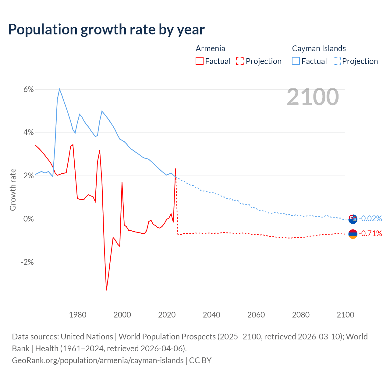- For the last 10 years, Armenia has had an average growth rate of +0.04% per year vs +2.19% in the Cayman Islands.