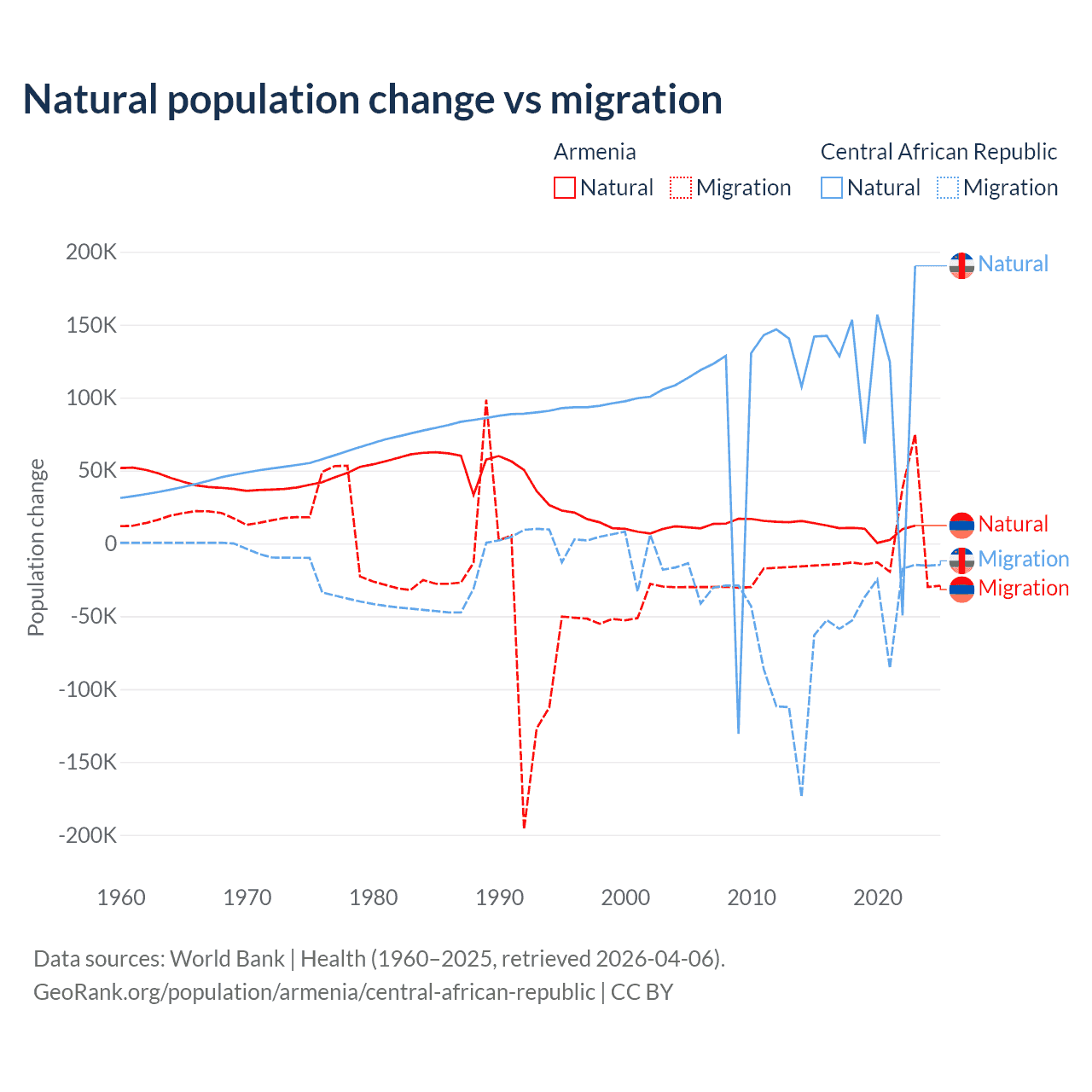 Over the last 10 years, 93.5% of the population change in Armenia is from natural causes (a gain of 97,267 people) and 6.54% is from migration (a loss of 6,808 people). In the Central African Republic 66.7% is from natural causes (a gain of 1,164,312 people) and 33.3% is from migration (a loss of 580,593 people).
