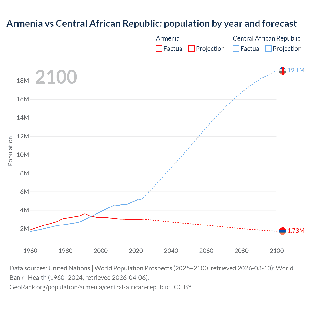 The latest officially reported population of Armenia was 3,033,500 in 2024 vs 5,330,690 people in the Central African Republic in 2024. In 2026, based on the adjusted UN estimation, the current Armenia's population is 2,989,841 people compared to 5,753,659 in the Central African Republic.