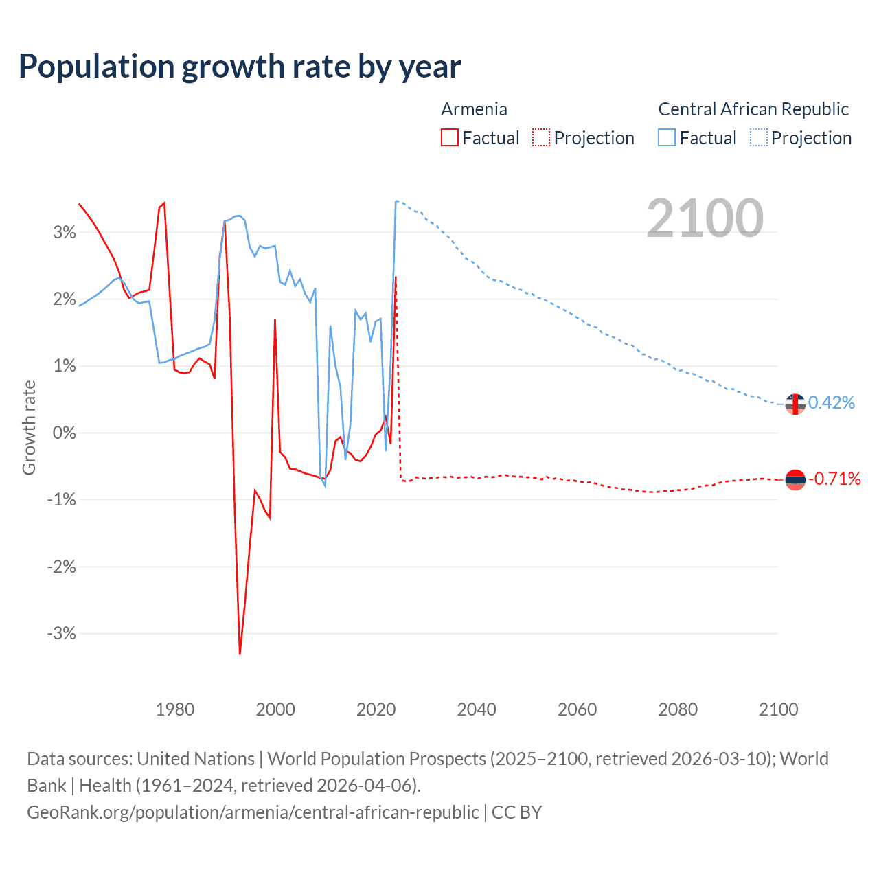 - For the last 10 years, Armenia has had an average growth rate of +0.04% per year vs +1.27% in the Central African Republic.