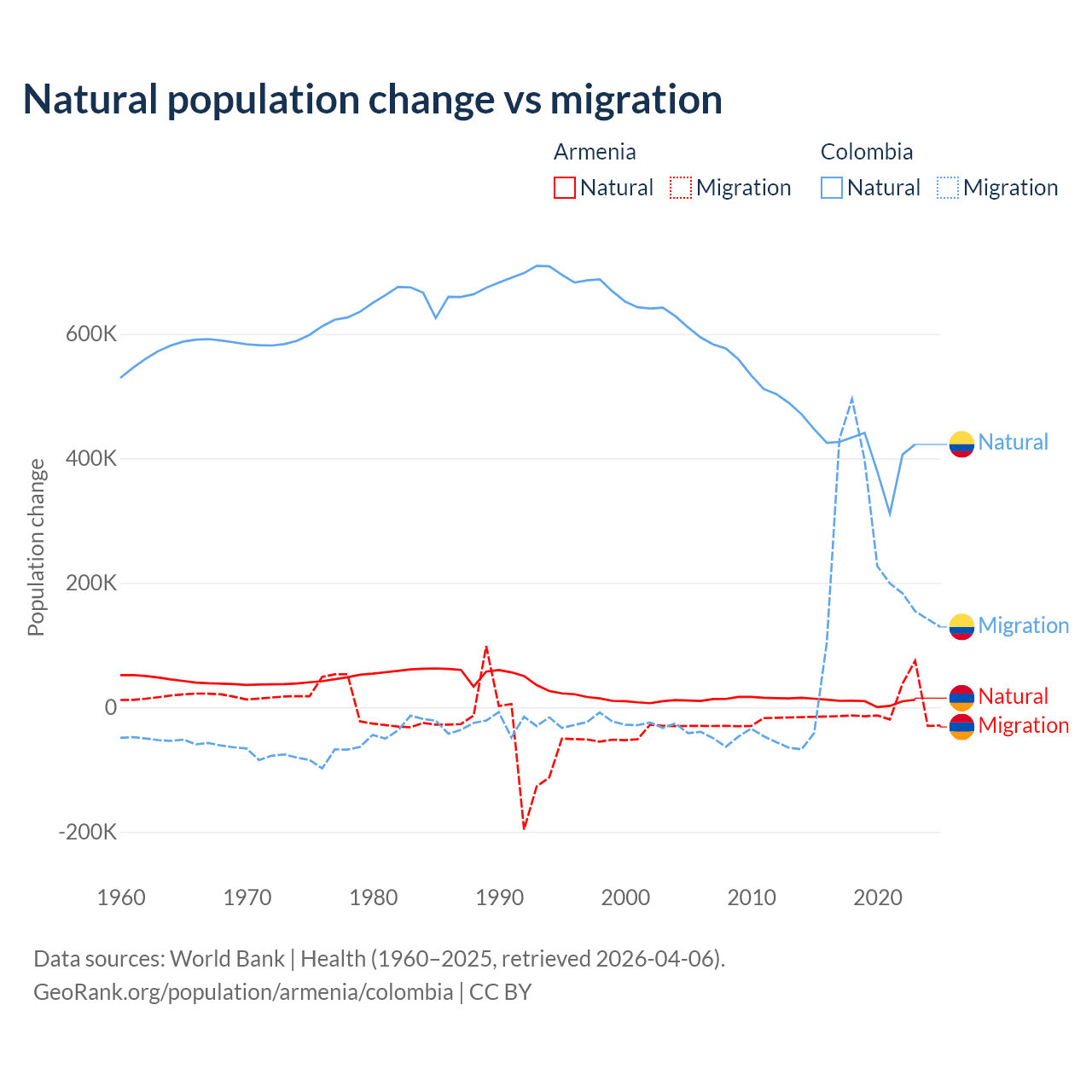 Over the last 10 years, 93.5% of the population change in Armenia is from natural causes (a gain of 97,267 people) and 6.54% is from migration (a loss of 6,808 people). In Colombia 66.6% is from natural causes (a gain of 4,162,856 people) and 33.4% is from migration (a gain of 2,083,051 people).
