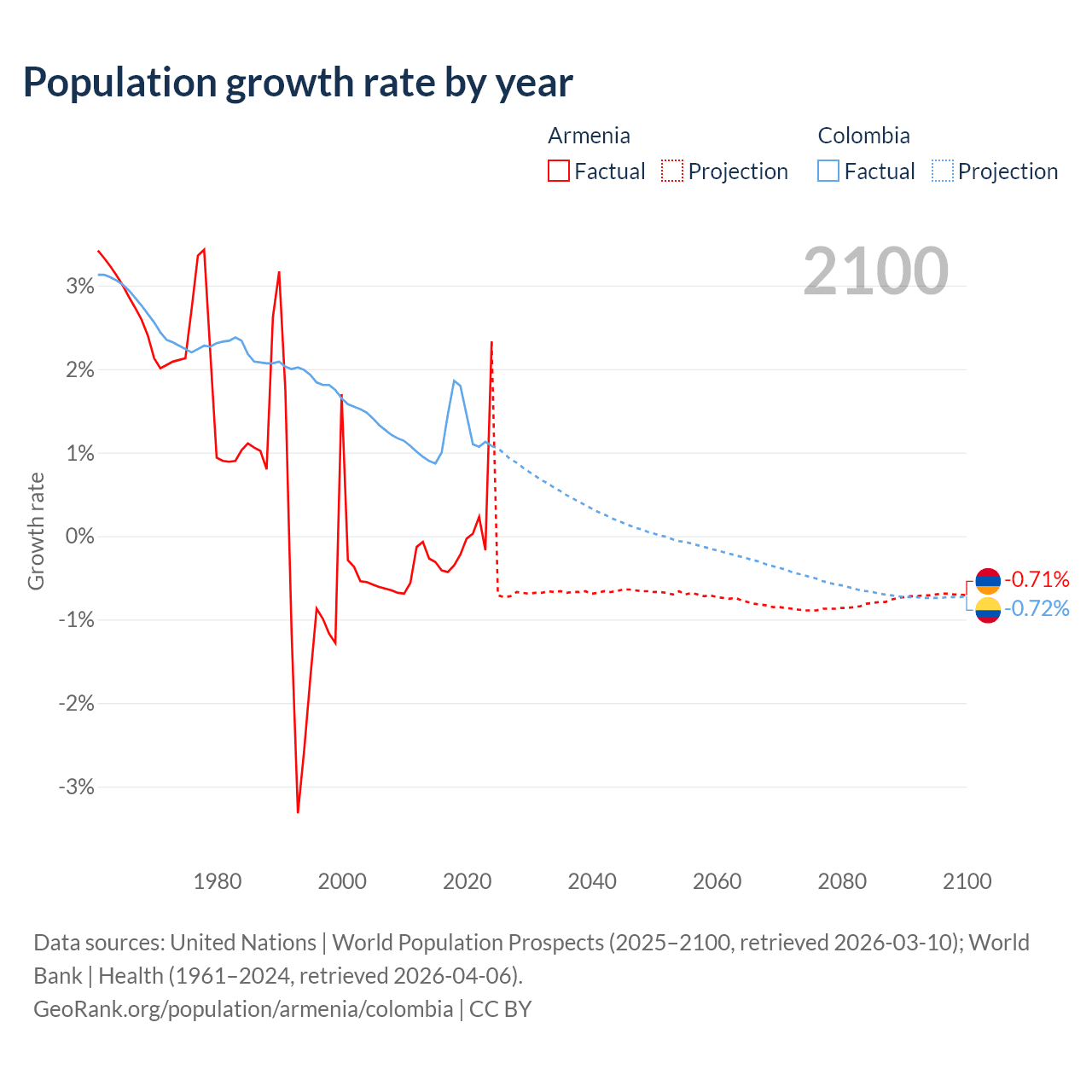 - For the last 10 years, Armenia has had an average growth rate of +0.04% per year vs +1.25% in Colombia.