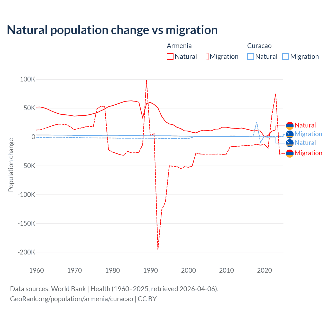 Over the last 10 years, 93.5% of the population change in Armenia is from natural causes (a gain of 97,267 people) and 6.54% is from migration (a loss of 6,808 people). In Curacao 3.72% is from natural causes (a gain of 834 people) and 96.3% is from migration (a gain of 21,615 people).