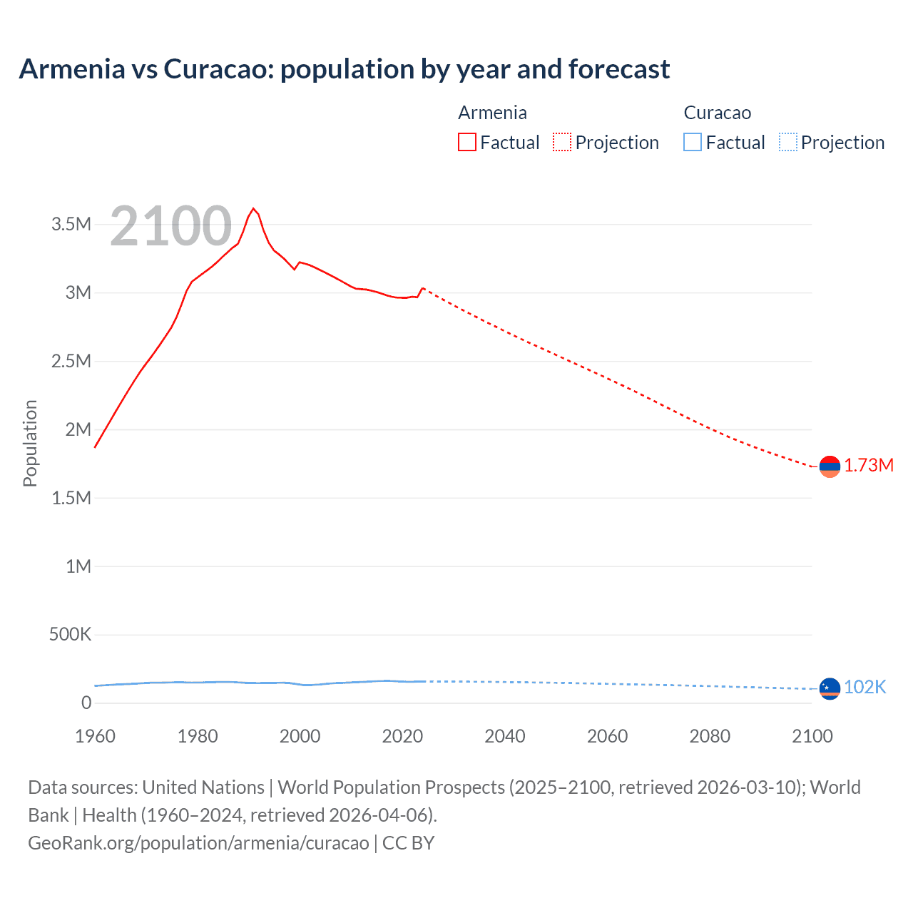 The latest officially reported population of Armenia was 3,033,500 in 2024 vs 155,967 people in Curacao in 2024. In 2026, based on the adjusted UN estimation, the current Armenia's population is 2,989,841 people compared to 155,976 in Curacao.
