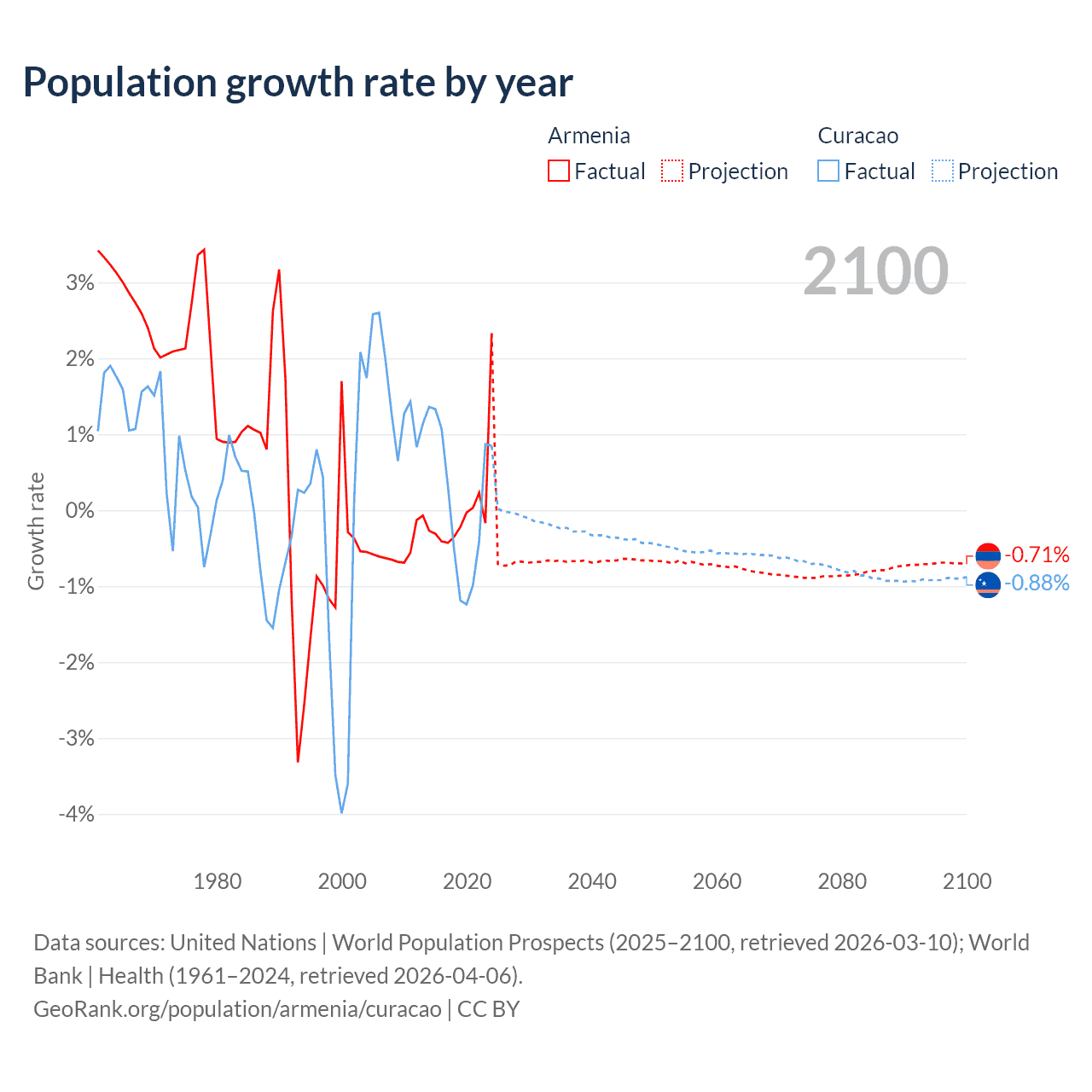 - For the last 10 years, Armenia has had an average growth rate of +0.04% per year vs +0.13% in Curacao.