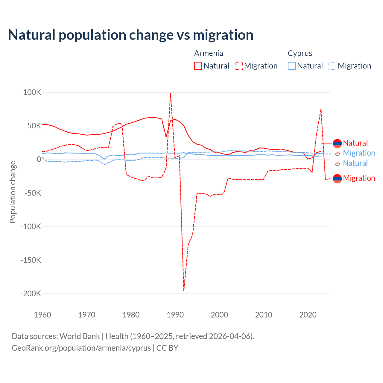 Over the last 10 years, 93.5% of the population change in Armenia is from natural causes (a gain of 97,267 people) and 6.54% is from migration (a loss of 6,808 people). In Cyprus 36.2% is from natural causes (a gain of 57,464 people) and 63.8% is from migration (a gain of 101,458 people).