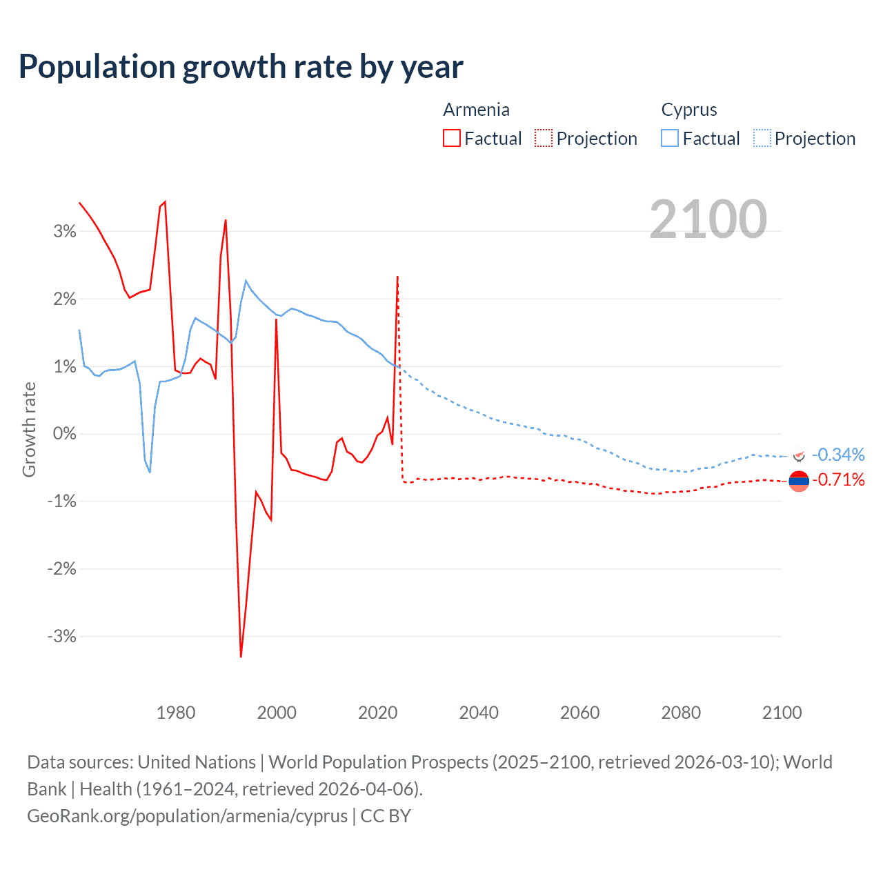 - For the last 10 years, Armenia has had an average growth rate of +0.04% per year vs +1.26% in Cyprus.