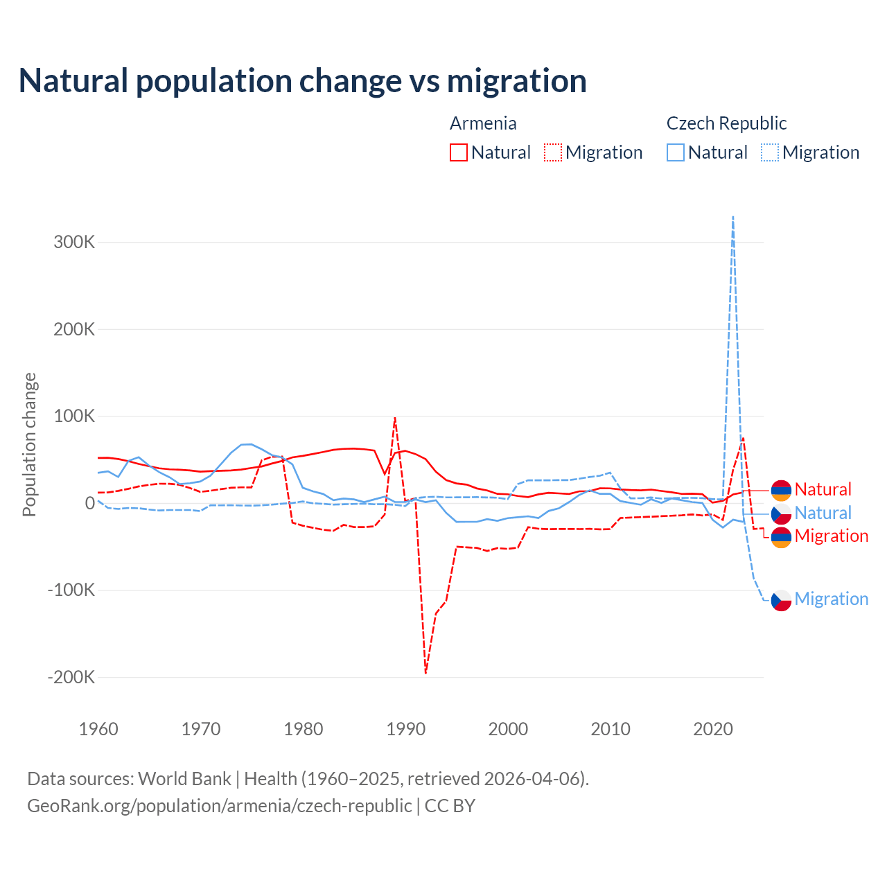 Over the last 10 years, 93.5% of the population change in Armenia is from natural causes (a gain of 97,267 people) and 6.54% is from migration (a loss of 6,808 people). In the Czech Republic 17.3% is from natural causes (a loss of 74,826 people) and 82.7% is from migration (a gain of 357,502 people).