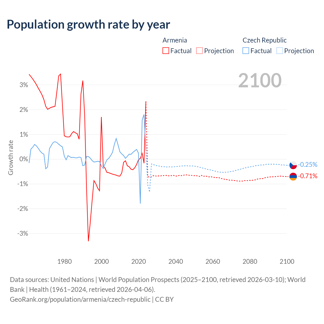 - For the last 10 years, Armenia has had an average growth rate of +0.04% per year vs +0.34% in the Czech Republic.