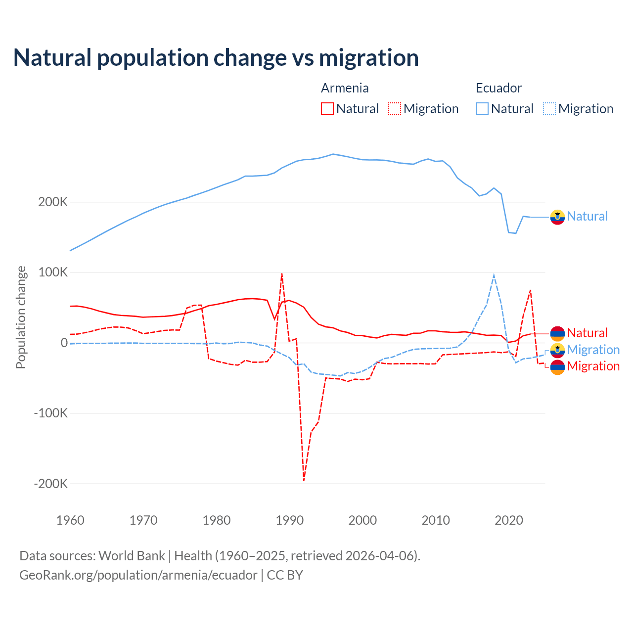 Over the last 10 years, 93.5% of the population change in Armenia is from natural causes (a gain of 97,267 people) and 6.54% is from migration (a loss of 6,808 people). In Ecuador 91.9% is from natural causes (a gain of 1,964,352 people) and 8.08% is from migration (a gain of 172,707 people).