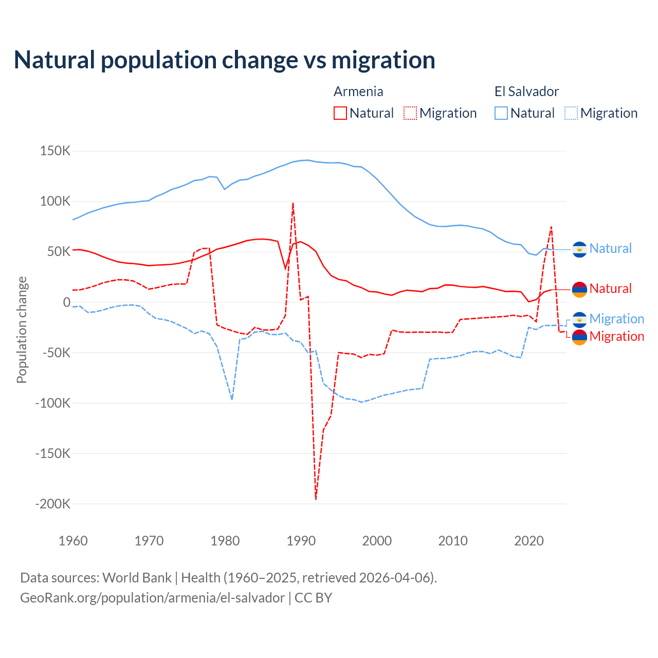 Over the last 10 years, 93.5% of the population change in Armenia is from natural causes (a gain of 97,267 people) and 6.54% is from migration (a loss of 6,808 people). In El Salvador 58.8% is from natural causes (a gain of 579,641 people) and 41.2% is from migration (a loss of 406,874 people).