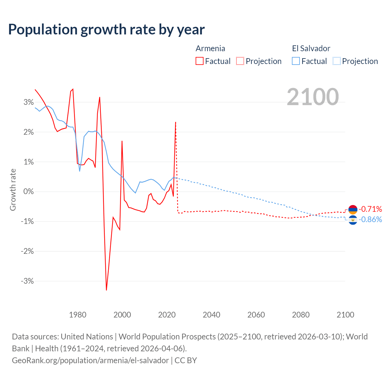 - For the last 10 years, Armenia has had an average growth rate of +0.04% per year vs +0.29% in El Salvador.