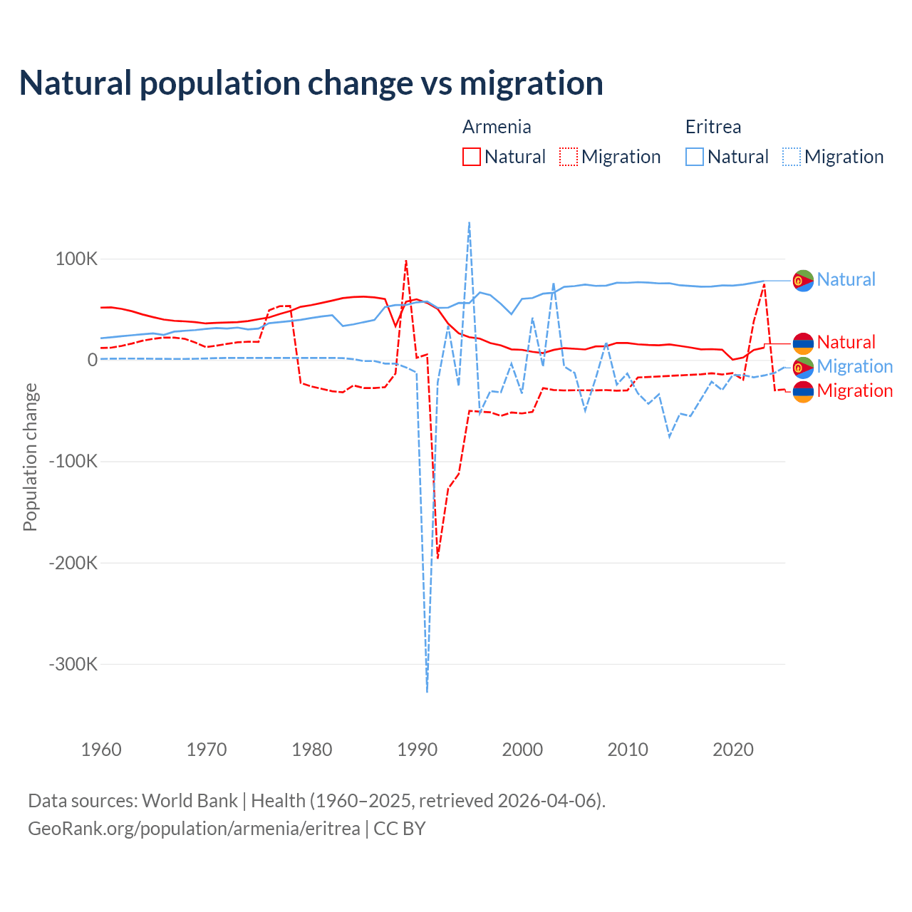 Over the last 10 years, 93.5% of the population change in Armenia is from natural causes (a gain of 97,267 people) and 6.54% is from migration (a loss of 6,808 people). In Eritrea 68.8% is from natural causes (a gain of 742,837 people) and 31.2% is from migration (a loss of 336,243 people).