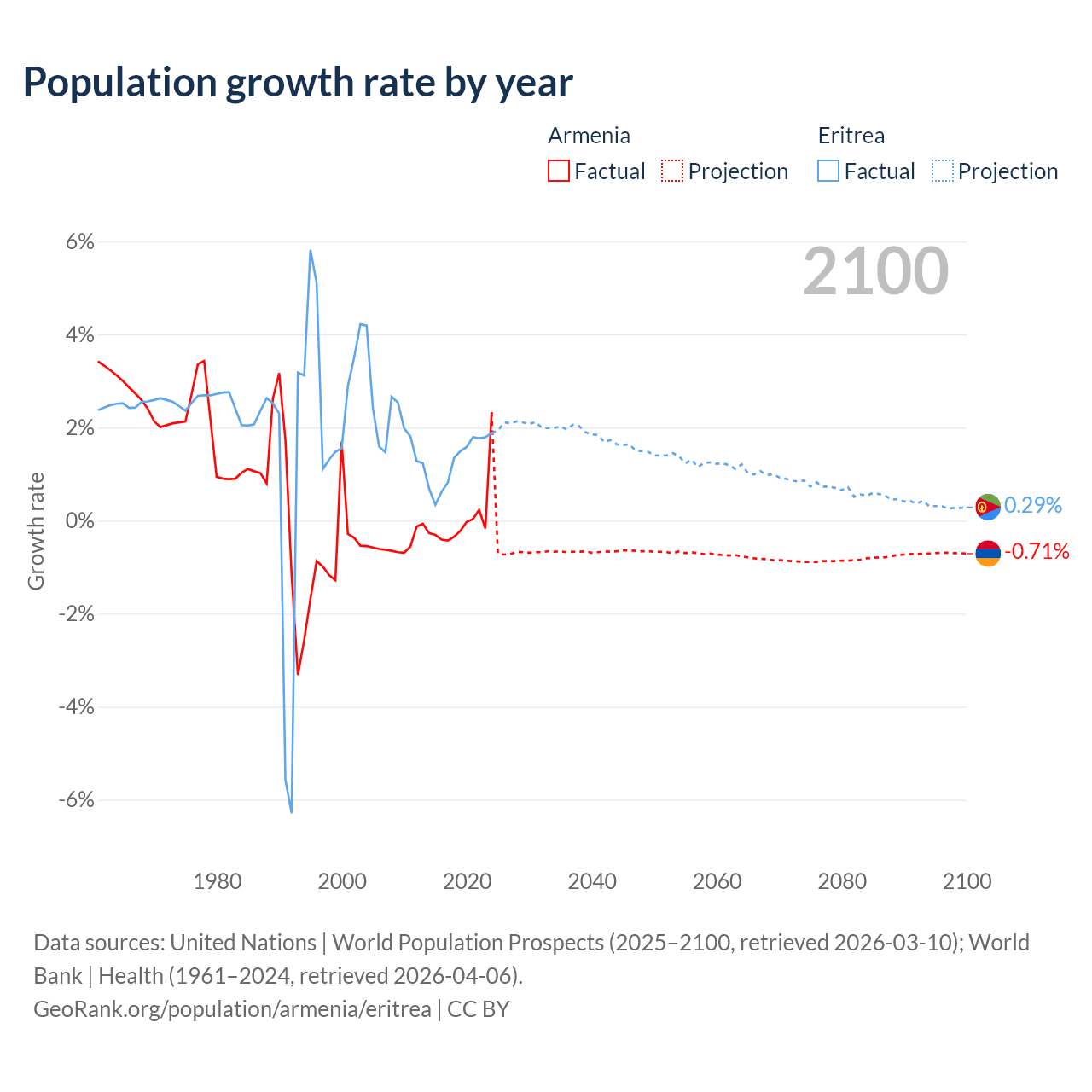 - For the last 10 years, Armenia has had an average growth rate of +0.04% per year vs +1.28% in Eritrea.