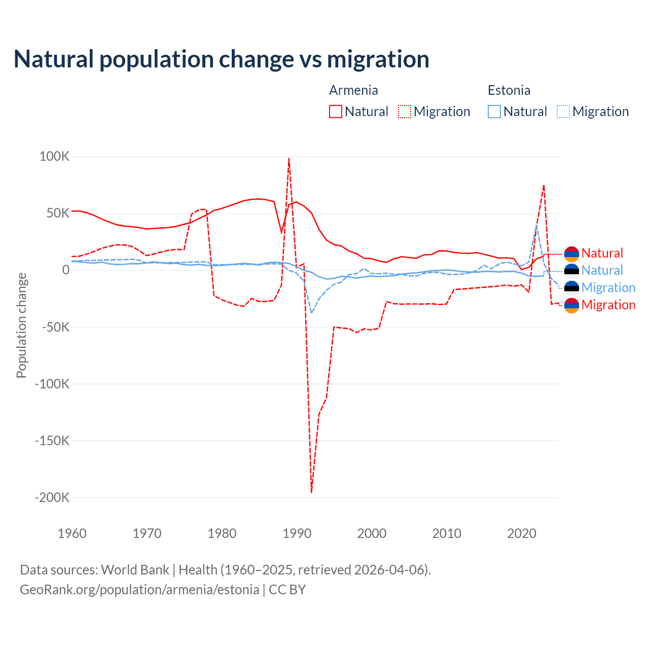 Over the last 10 years, 93.5% of the population change in Armenia is from natural causes (a gain of 97,267 people) and 6.54% is from migration (a loss of 6,808 people). In Estonia 26.1% is from natural causes (a loss of 27,683 people) and 73.9% is from migration (a gain of 78,553 people).