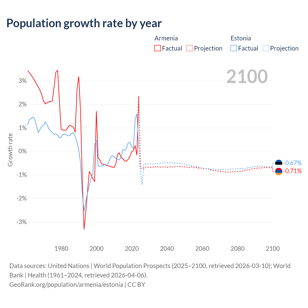 - For the last 10 years, Armenia has had an average growth rate of +0.04% per year vs +0.37% in Estonia.