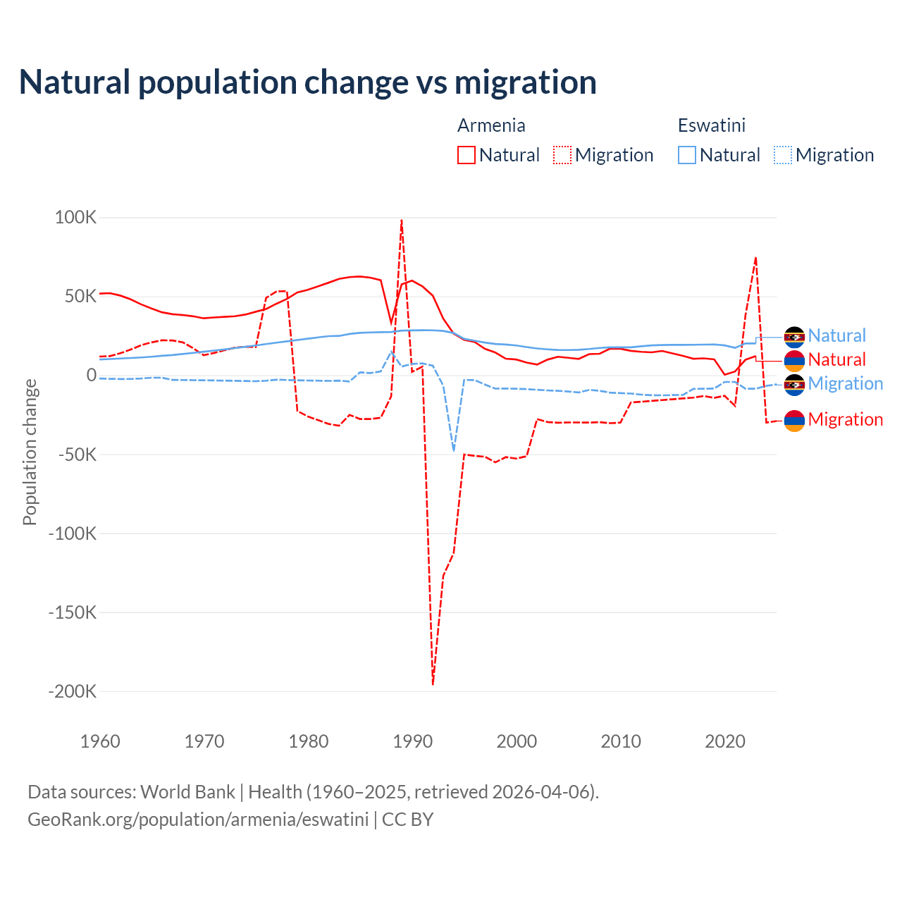 Over the last 10 years, 93.5% of the population change in Armenia is from natural causes (a gain of 97,267 people) and 6.54% is from migration (a loss of 6,808 people). In Eswatini 68.3% is from natural causes (a gain of 192,206 people) and 31.7% is from migration (a loss of 89,012 people).