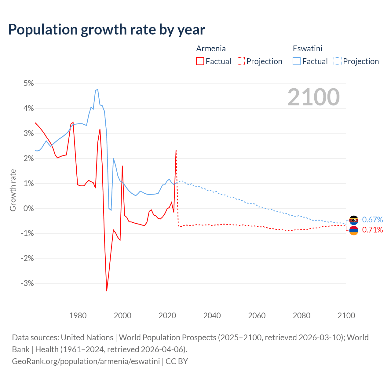 - For the last 10 years, Armenia has had an average growth rate of +0.04% per year vs +0.87% in Eswatini.