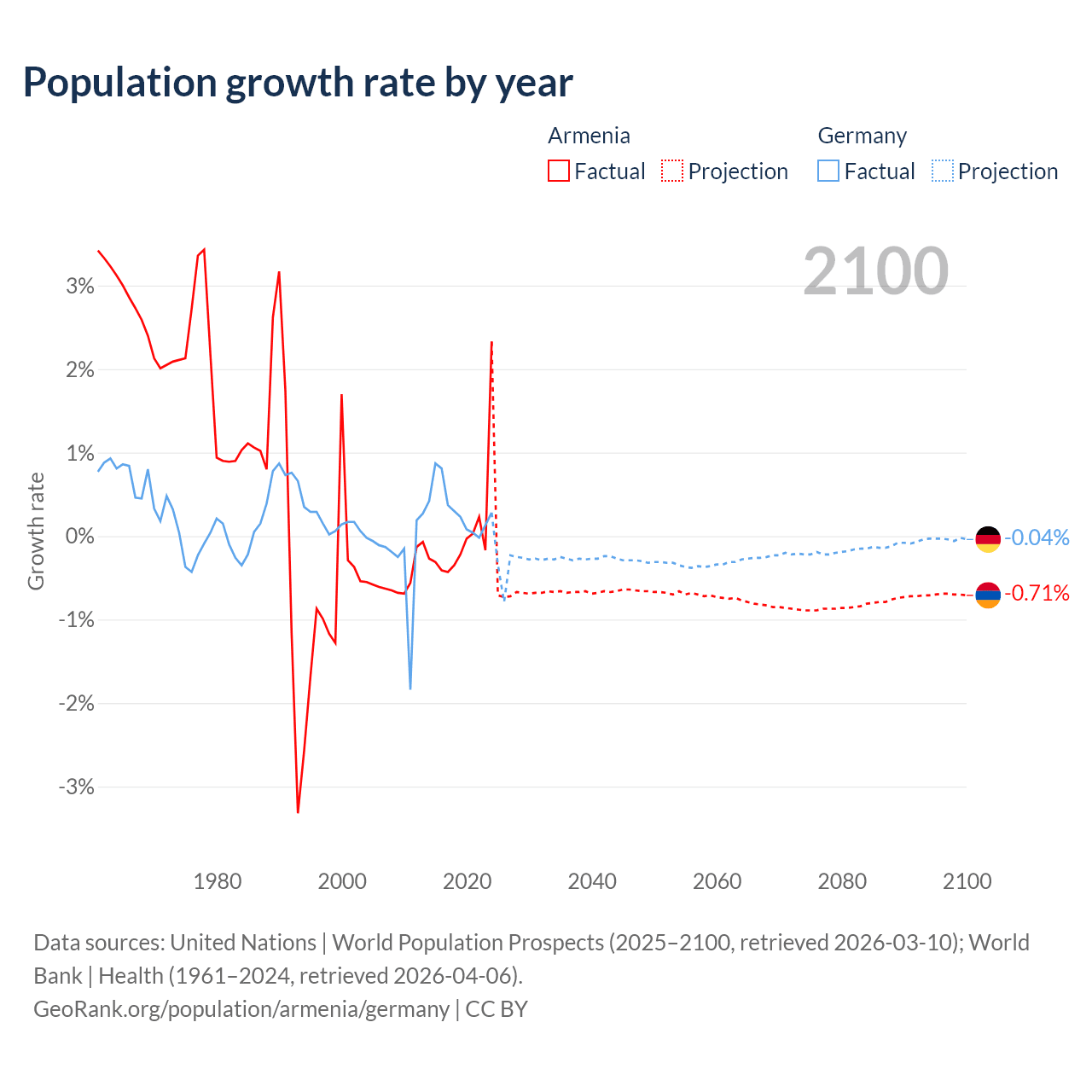 - For the last 10 years, Armenia has had an average growth rate of +0.04% per year vs +0.32% in Germany.