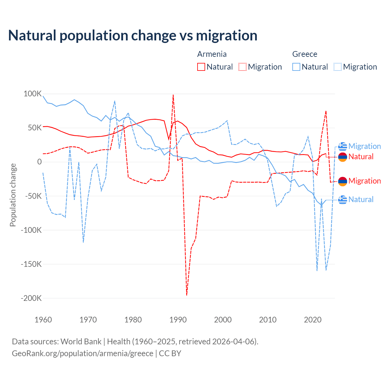 Over the last 10 years, 93.5% of the population change in Armenia is from natural causes (a gain of 97,267 people) and 6.54% is from migration (a loss of 6,808 people). In Greece 51.9% is from natural causes (a loss of 411,426 people) and 48.1% is from migration (a loss of 381,824 people).