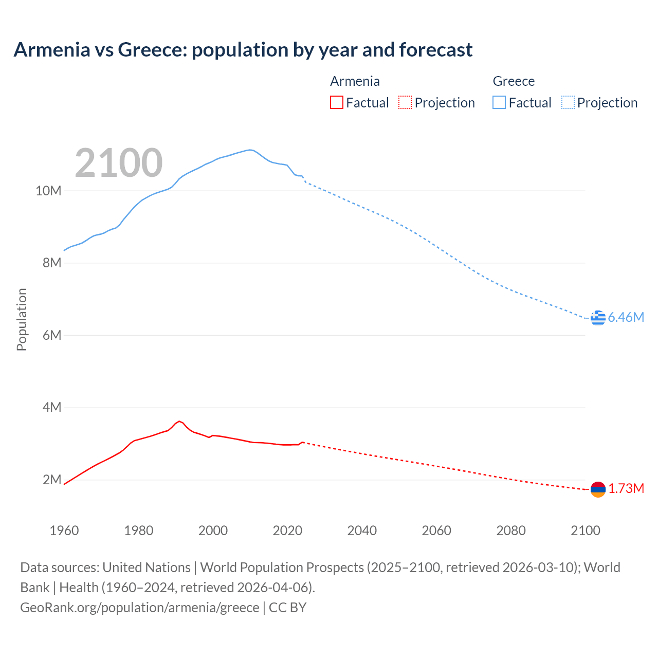 Armenia vs Greece: population by year and forecast