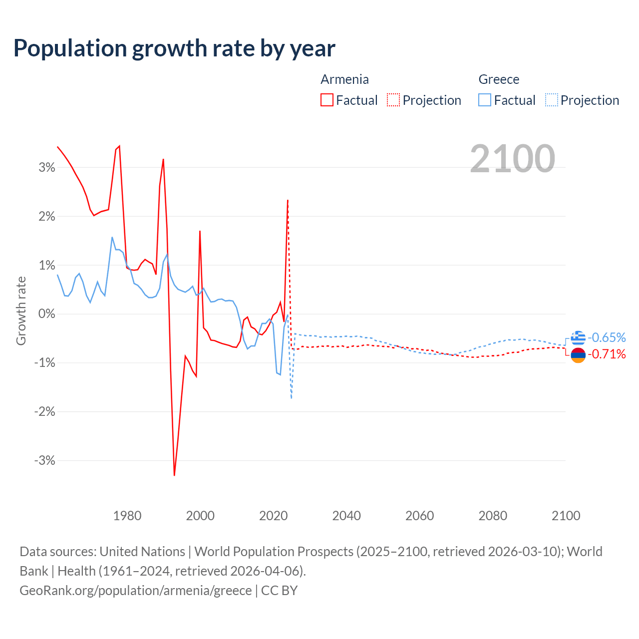 - For the last 10 years, Armenia has had an average growth rate of +0.04% per year vs -0.47% in Greece.