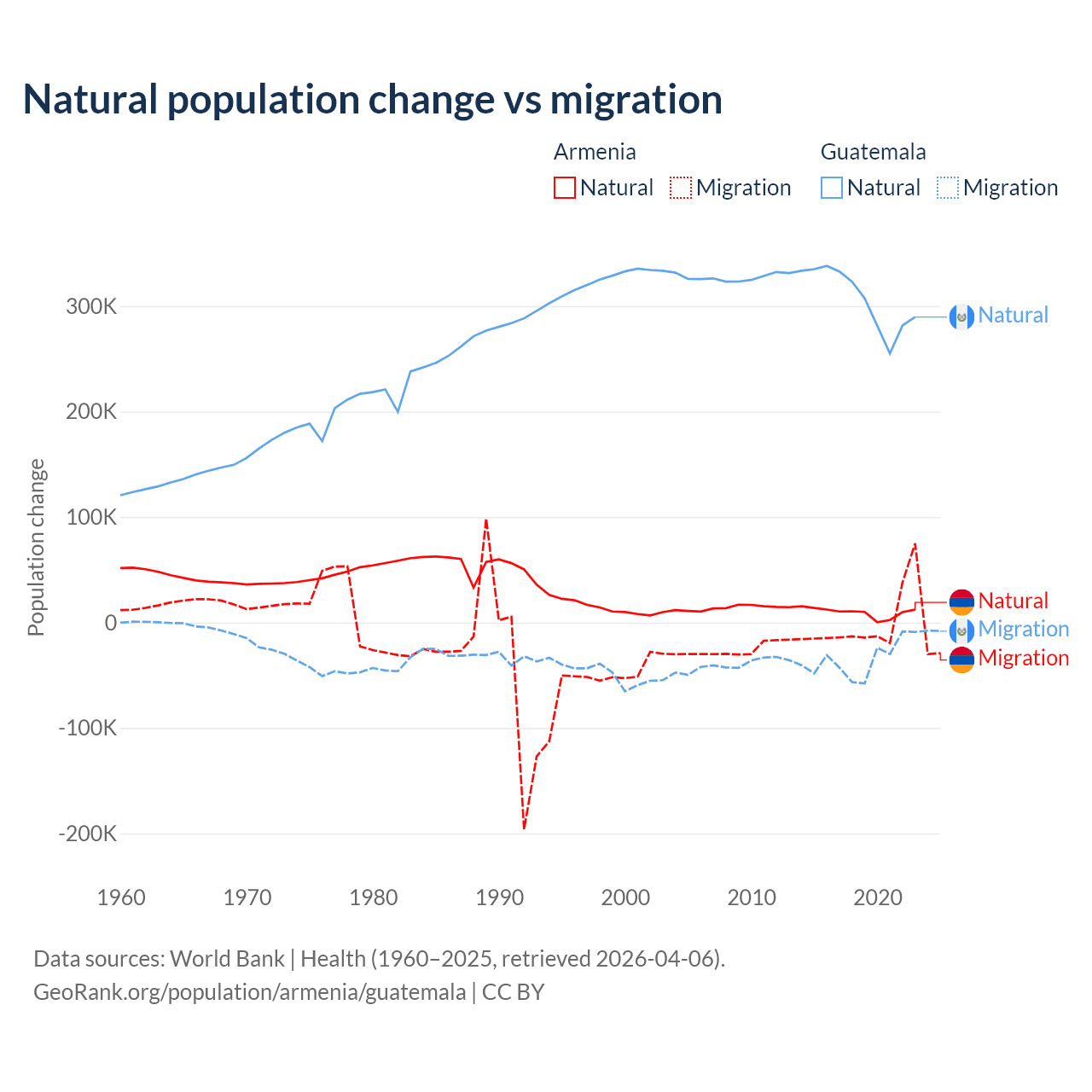 Over the last 10 years, 93.5% of the population change in Armenia is from natural causes (a gain of 97,267 people) and 6.54% is from migration (a loss of 6,808 people). In Guatemala 89.8% is from natural causes (a gain of 3,077,847 people) and 10.2% is from migration (a loss of 347,818 people).