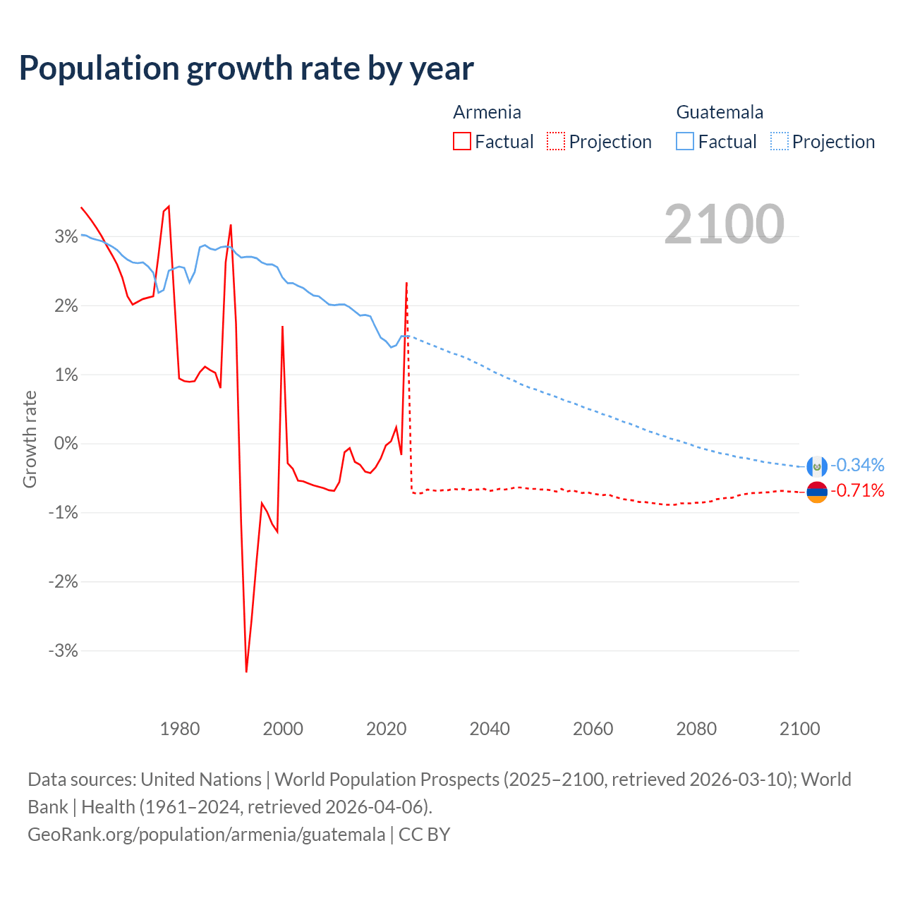 - For the last 10 years, Armenia has had an average growth rate of +0.04% per year vs +1.64% in Guatemala.
