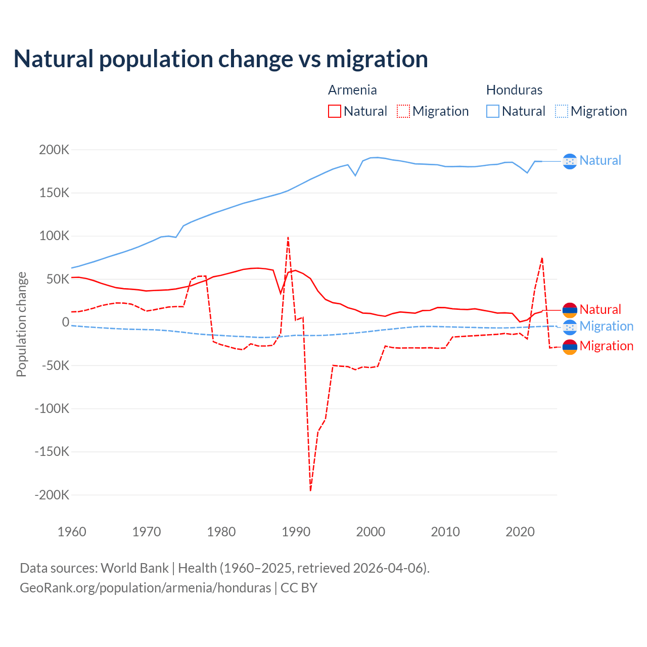 Over the last 10 years, 93.5% of the population change in Armenia is from natural causes (a gain of 97,267 people) and 6.54% is from migration (a loss of 6,808 people). In Honduras 96.7% is from natural causes (a gain of 1,821,125 people) and 3.29% is from migration (a loss of 61,965 people).