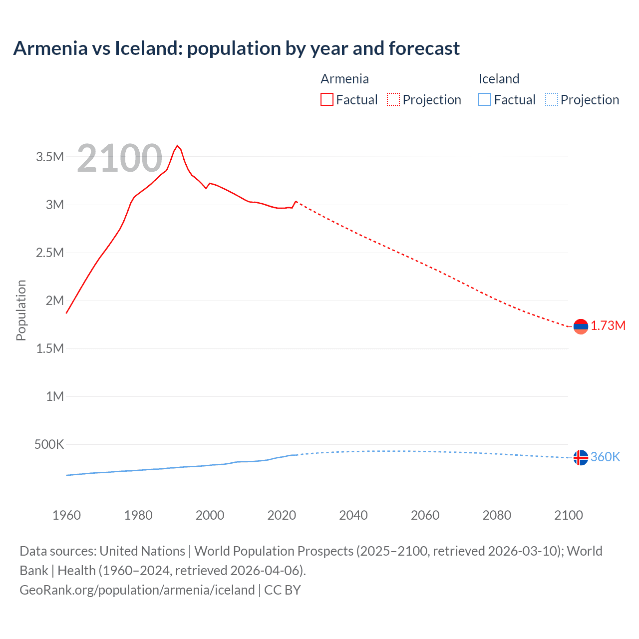 The latest officially reported population of Armenia was 3,033,500 in 2024 vs 386,506 people in Iceland in 2024. In 2026, based on the adjusted UN estimation, the current Armenia's population is 2,989,841 people compared to 397,129 in Iceland.