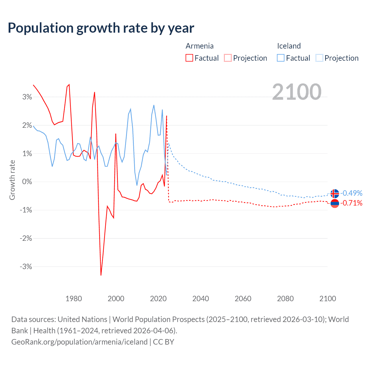 - For the last 10 years, Armenia has had an average growth rate of +0.04% per year vs +1.63% in Iceland.