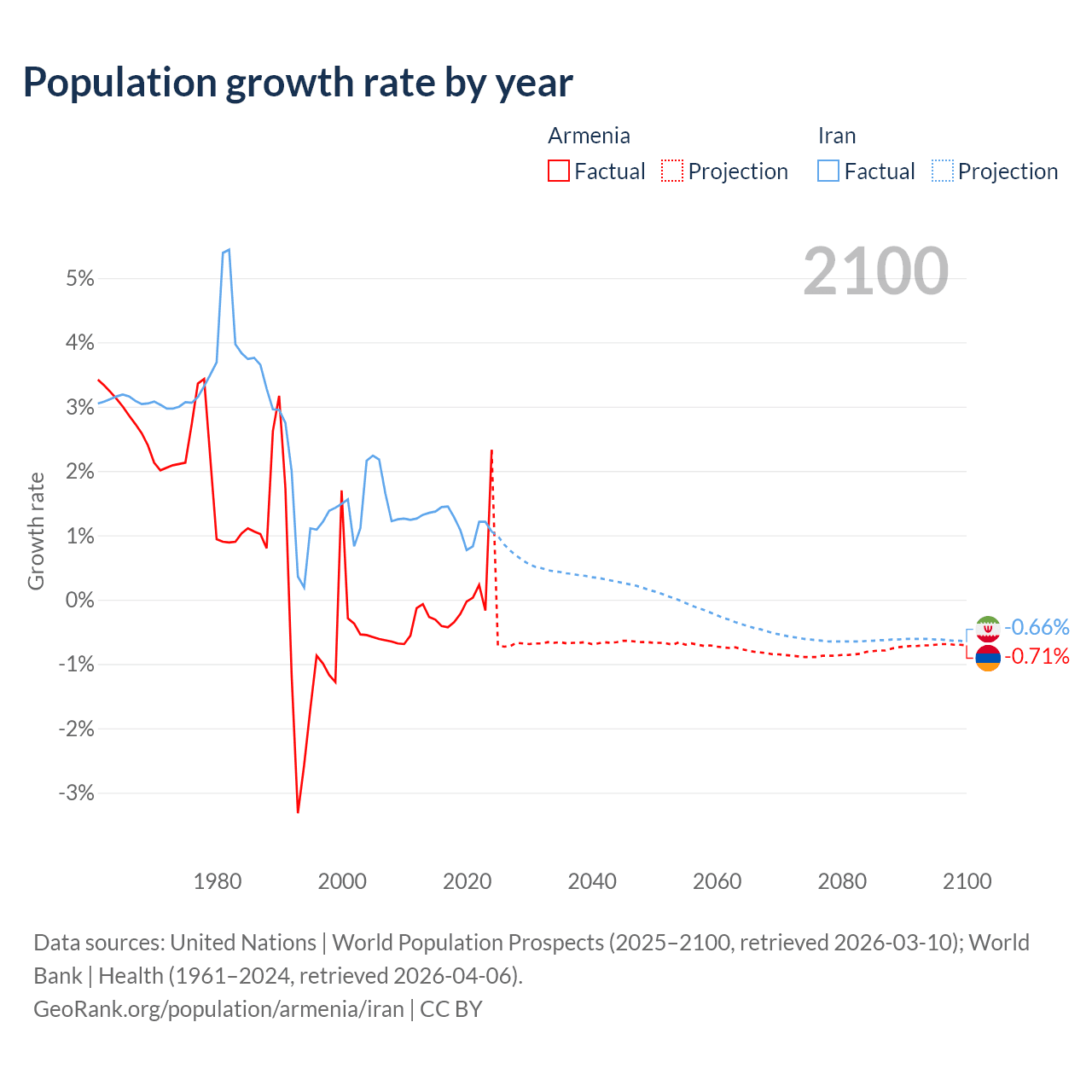 - For the last 10 years, Armenia has had an average growth rate of +0.04% per year vs +1.19% in Iran.
