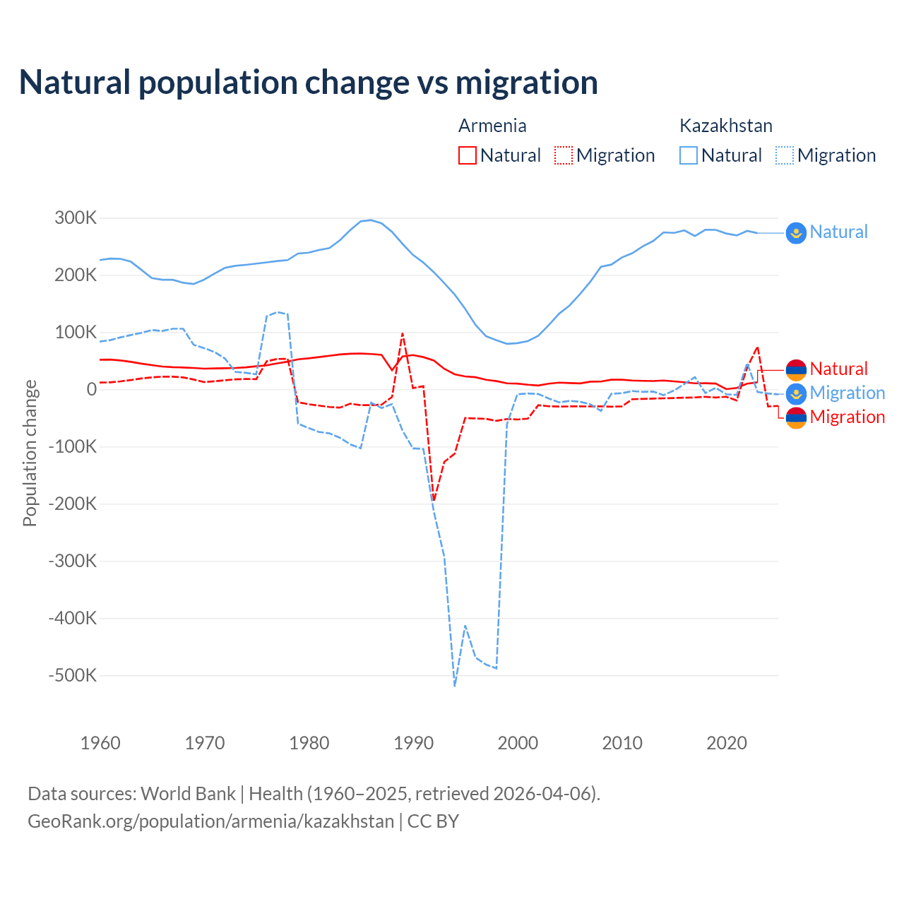 Over the last 10 years, 93.5% of the population change in Armenia is from natural causes (a gain of 97,267 people) and 6.54% is from migration (a loss of 6,808 people). In Kazakhstan 98.7% is from natural causes (a gain of 2,743,094 people) and 1.33% is from migration (a gain of 36,908 people).