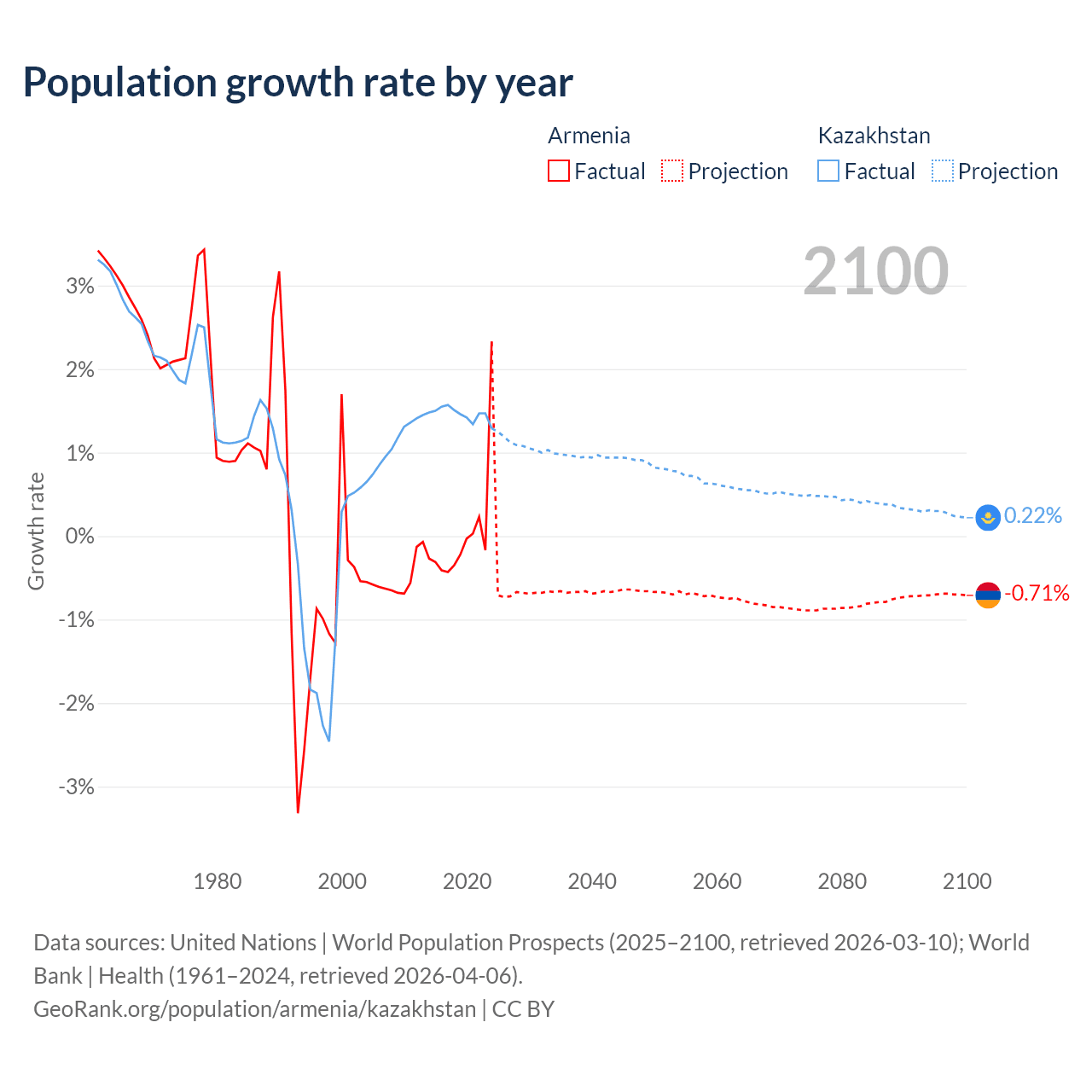 - For the last 10 years, Armenia has had an average growth rate of +0.04% per year vs +1.46% in Kazakhstan.