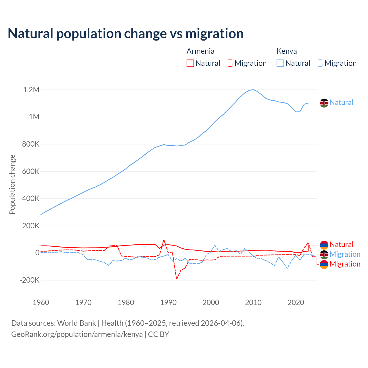 Over the last 10 years, 93.5% of the population change in Armenia is from natural causes (a gain of 97,267 people) and 6.54% is from migration (a loss of 6,808 people). In Kenya 95.3% is from natural causes (a gain of 10,892,362 people) and 4.67% is from migration (a loss of 533,876 people).