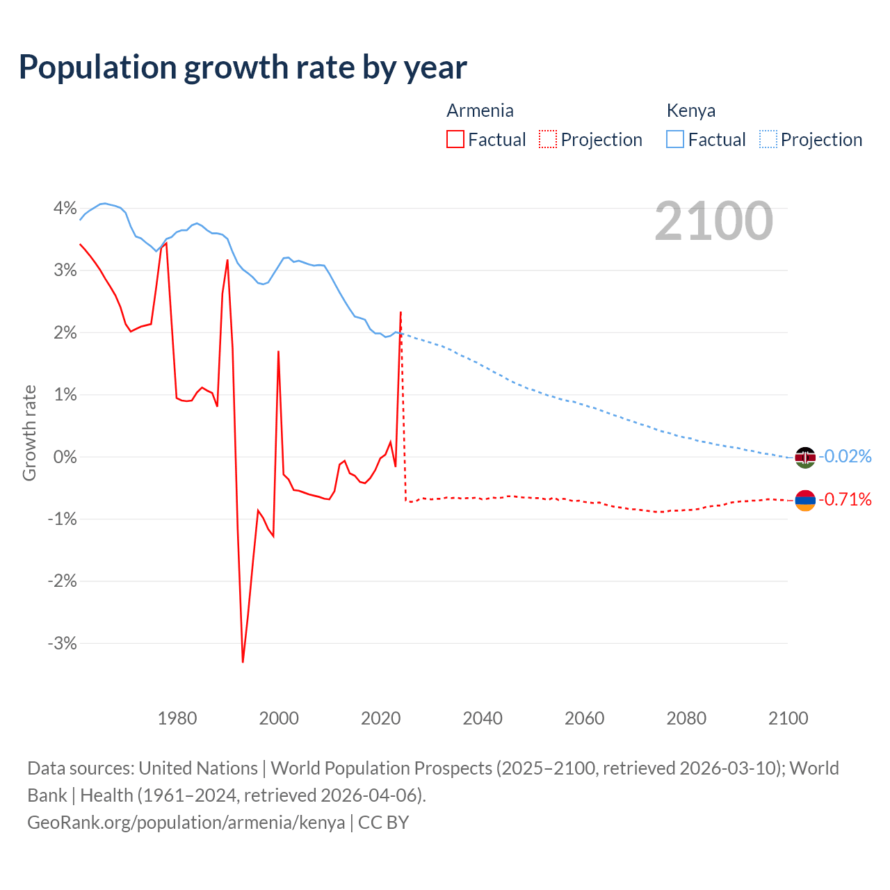 - For the last 10 years, Armenia has had an average growth rate of +0.04% per year vs +2.08% in Kenya.