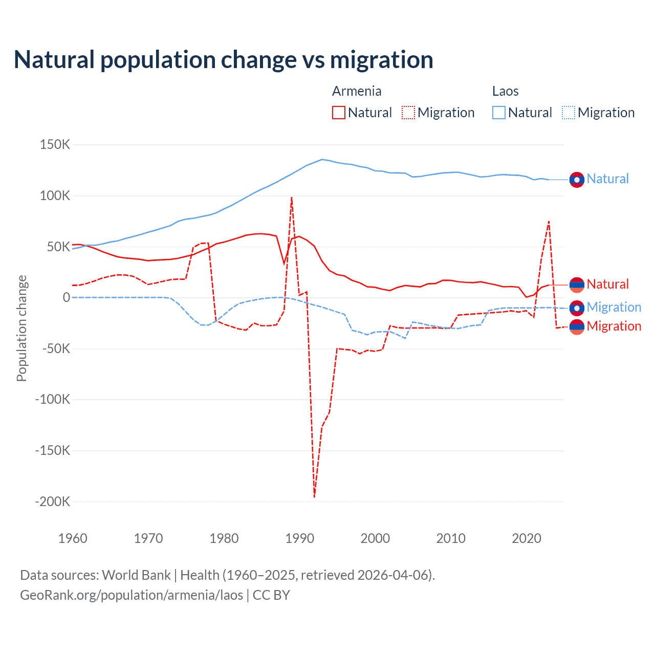 Over the last 10 years, 93.5% of the population change in Armenia is from natural causes (a gain of 97,267 people) and 6.54% is from migration (a loss of 6,808 people). In Laos 90.6% is from natural causes (a gain of 1,183,013 people) and 9.41% is from migration (a loss of 122,899 people).