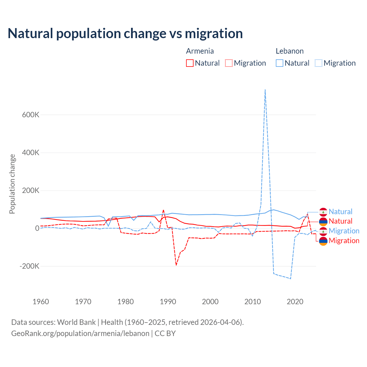 Over the last 10 years, 93.5% of the population change in Armenia is from natural causes (a gain of 97,267 people) and 6.54% is from migration (a loss of 6,808 people). In Lebanon 40.1% is from natural causes (a gain of 739,256 people) and 59.9% is from migration (a loss of 1,103,772 people).