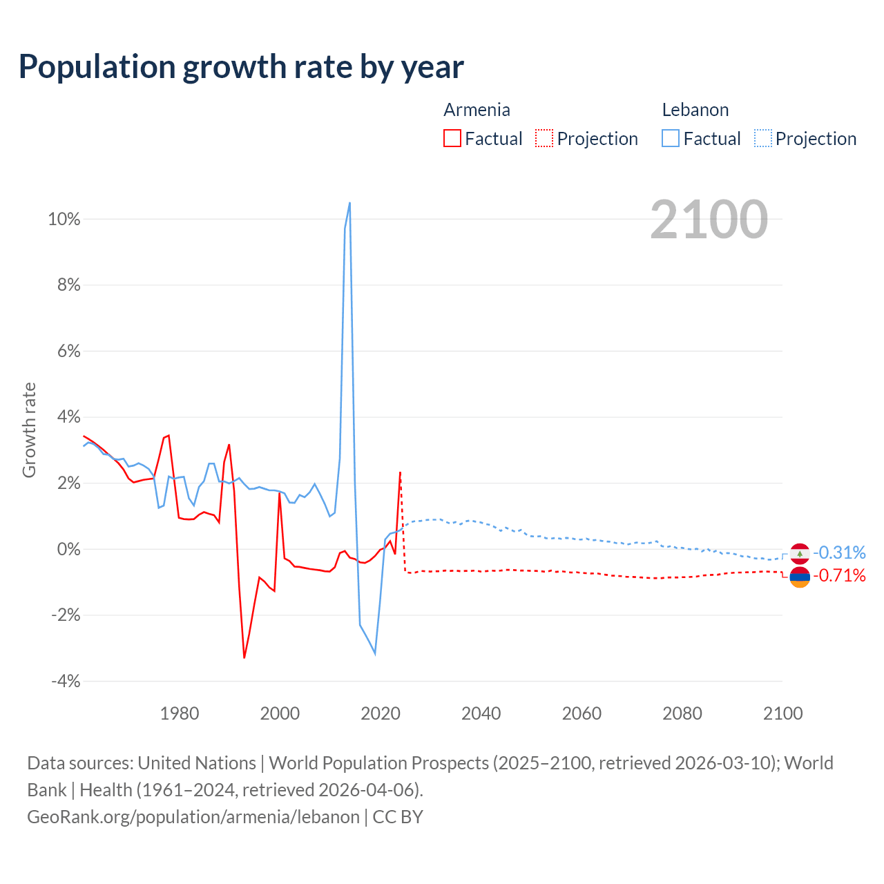 - For the last 10 years, Armenia has had an average growth rate of +0.04% per year vs +0.16% in Lebanon.