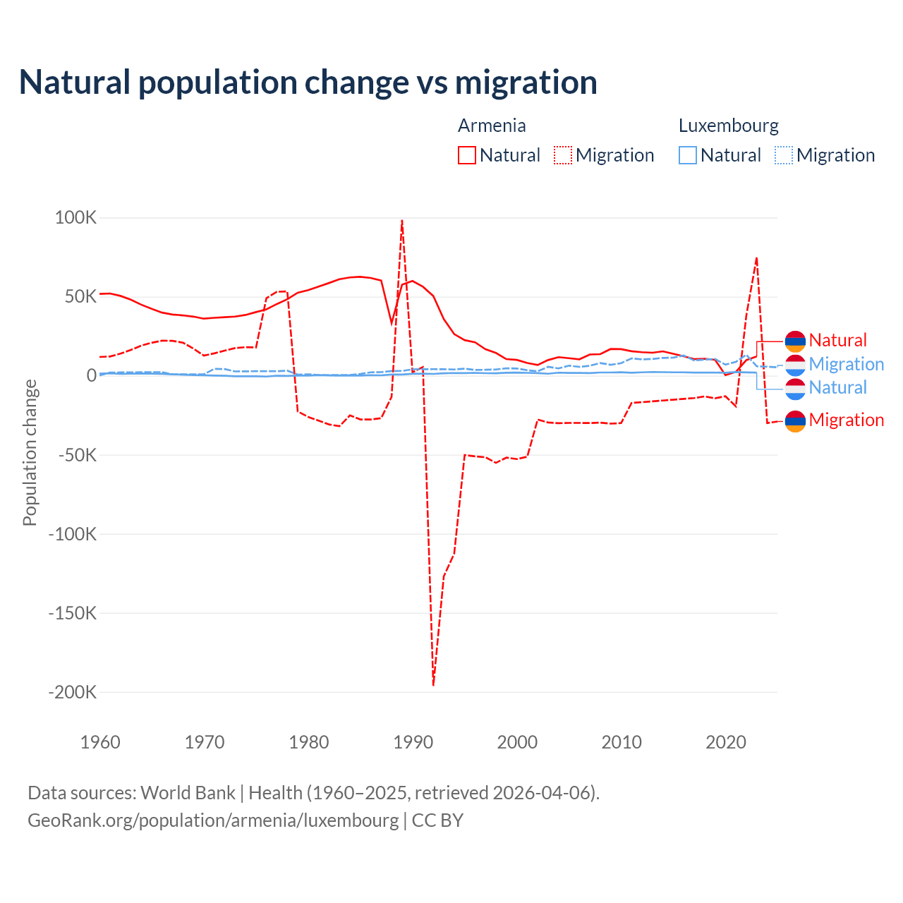 Over the last 10 years, 93.5% of the population change in Armenia is from natural causes (a gain of 97,267 people) and 6.54% is from migration (a loss of 6,808 people). In Luxembourg 16.8% is from natural causes (a gain of 20,287 people) and 83.2% is from migration (a gain of 100,435 people).