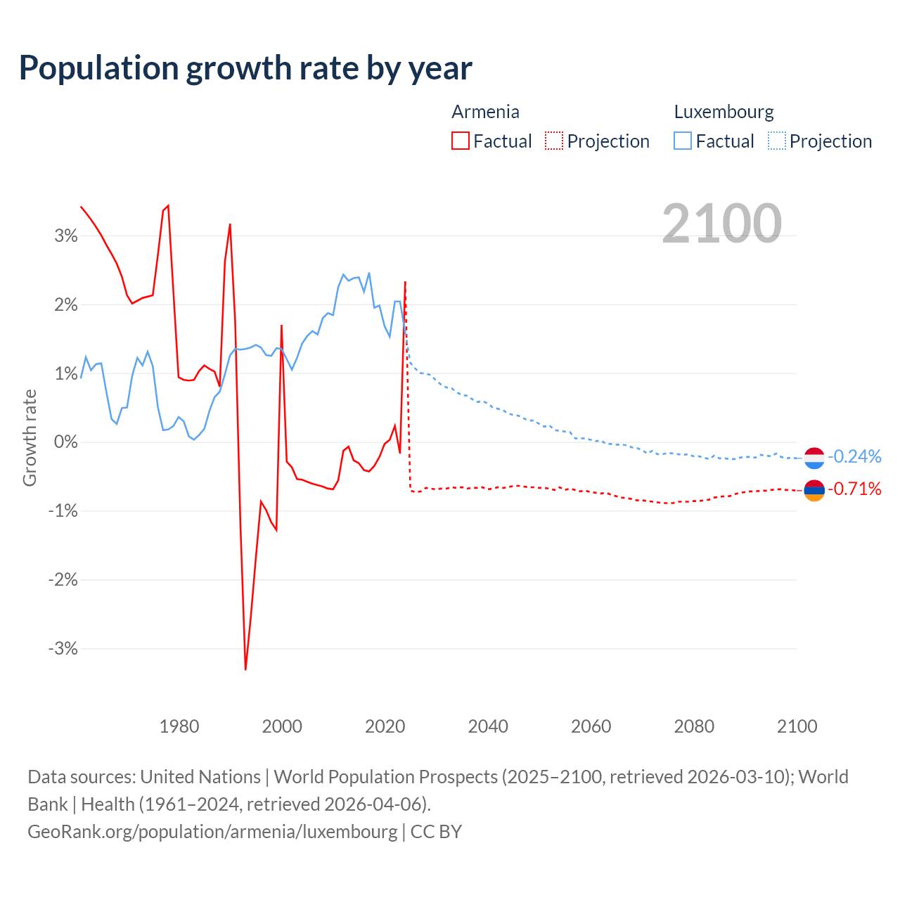 - For the last 10 years, Armenia has had an average growth rate of +0.04% per year vs +2.02% in Luxembourg.
