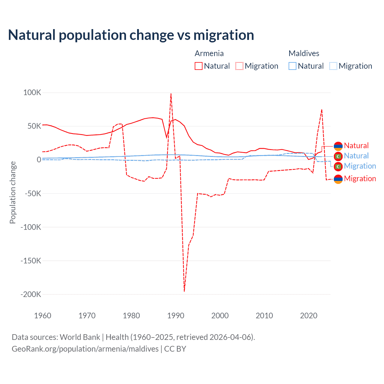 Over the last 10 years, 93.5% of the population change in Armenia is from natural causes (a gain of 97,267 people) and 6.54% is from migration (a loss of 6,808 people). In Maldives 42.7% is from natural causes (a gain of 51,342 people) and 57.3% is from migration (a gain of 68,788 people).