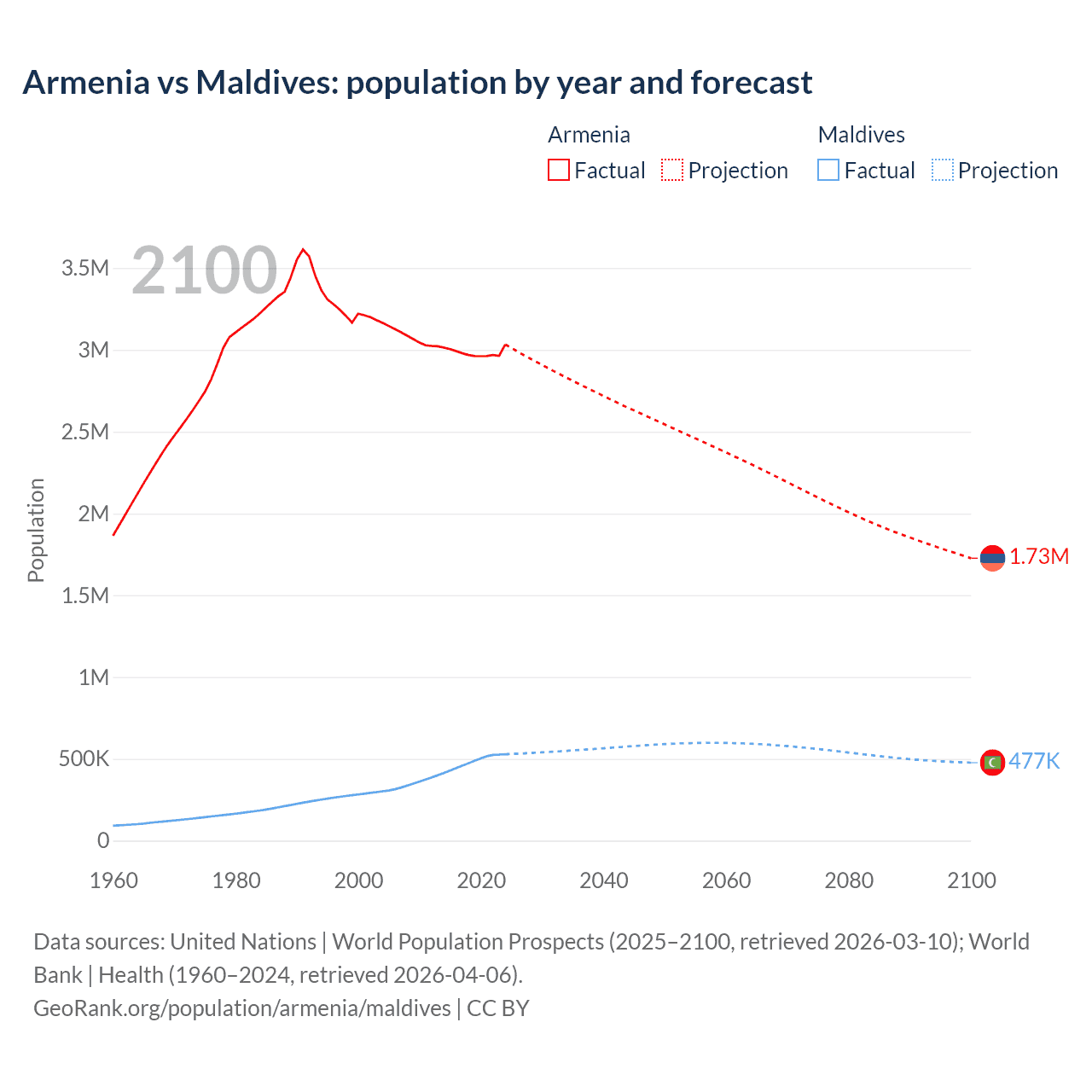Armenia vs Maldives: population by year and forecast