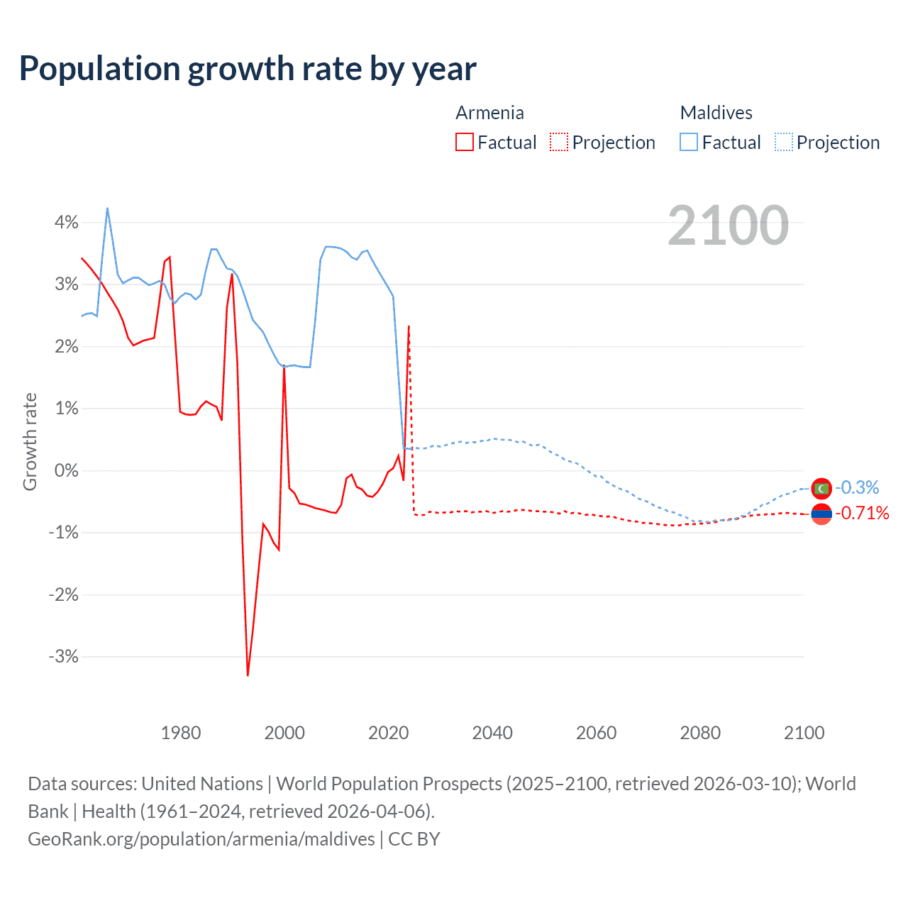 - For the last 10 years, Armenia has had an average growth rate of +0.04% per year vs +2.56% in Maldives.