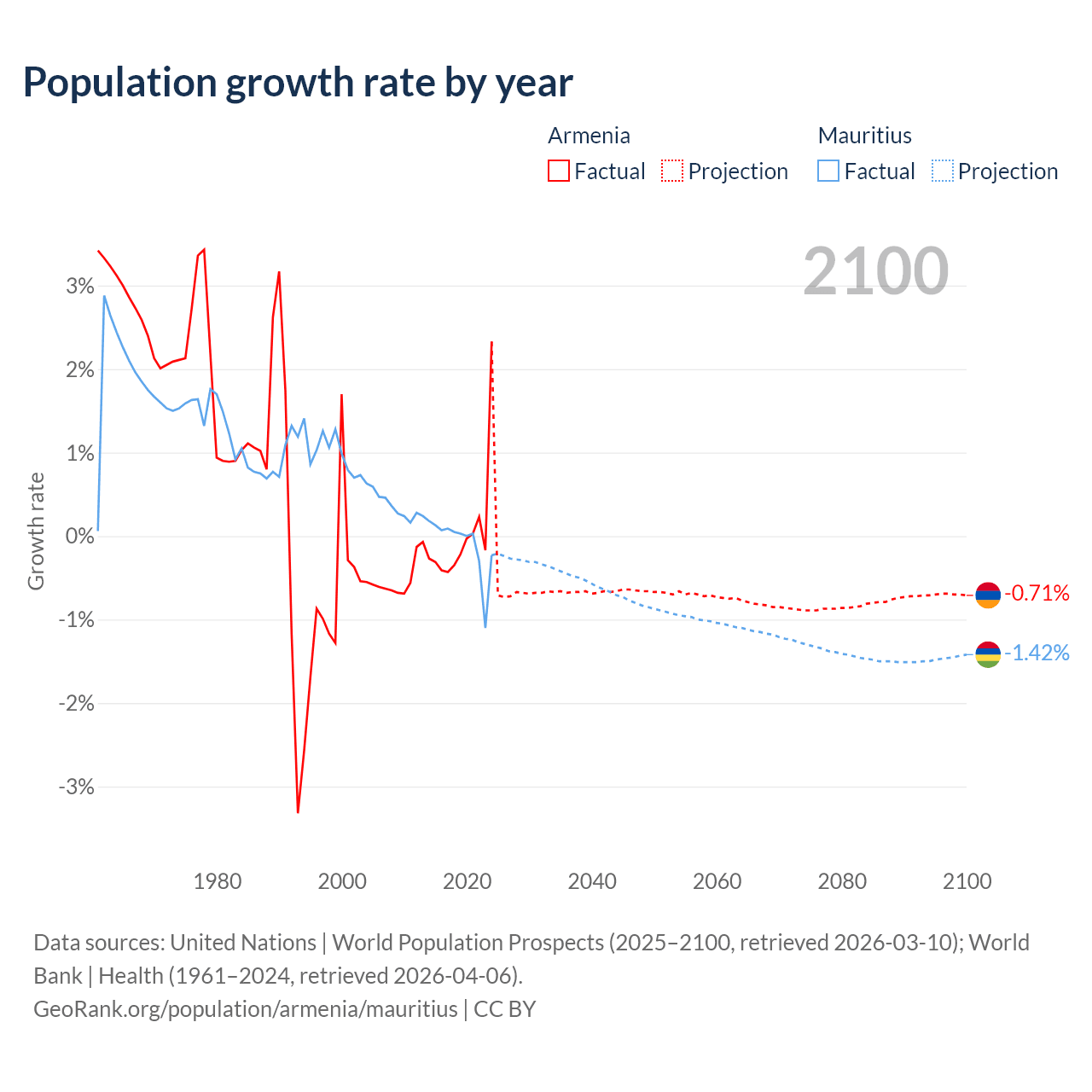 - For the last 10 years, Armenia has had an average growth rate of +0.04% per year vs -0.09% in Mauritius.