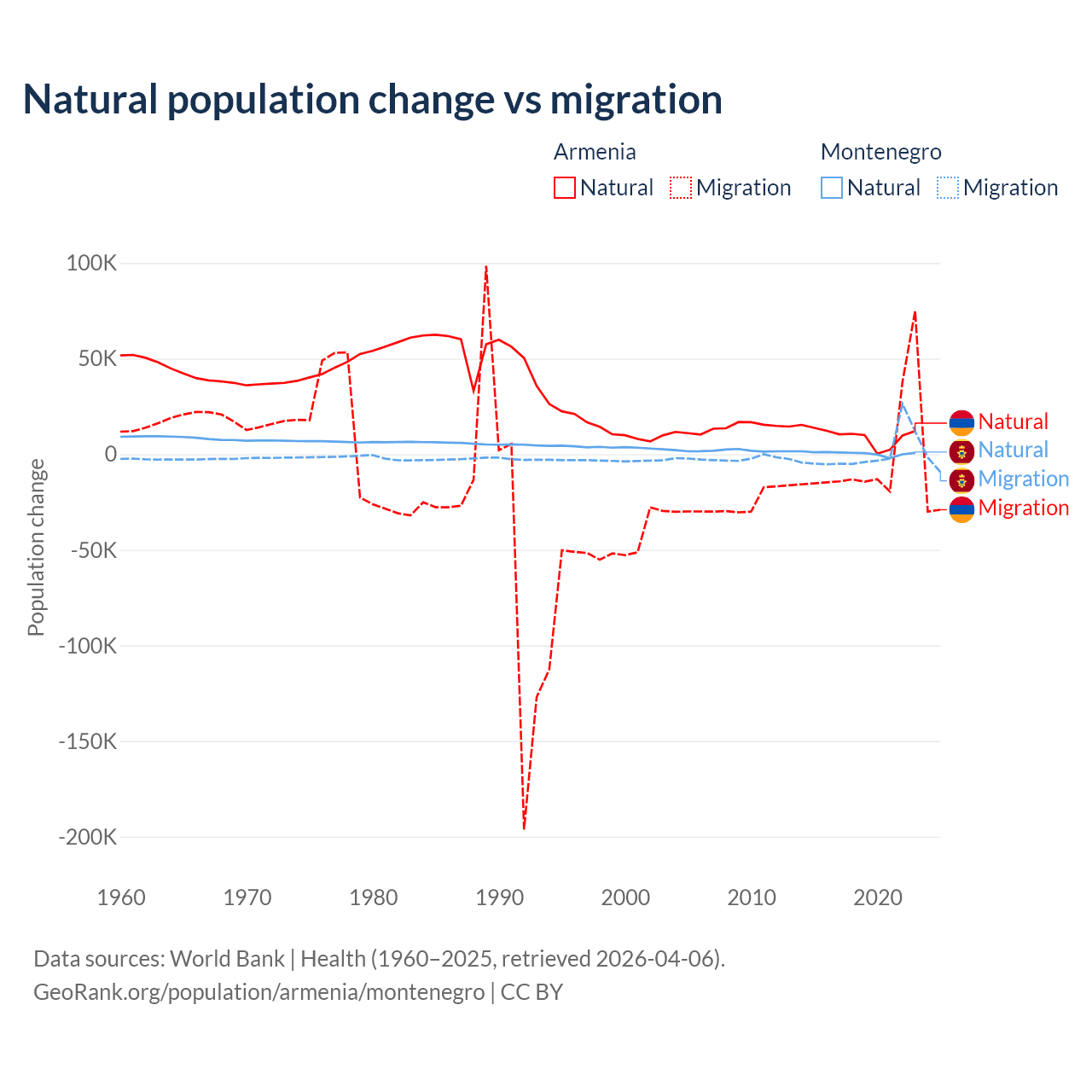 Over the last 10 years, 93.5% of the population change in Armenia is from natural causes (a gain of 97,267 people) and 6.54% is from migration (a loss of 6,808 people). In Montenegro 52.4% is from natural causes (a gain of 4,501 people) and 47.6% is from migration (a gain of 4,095 people).