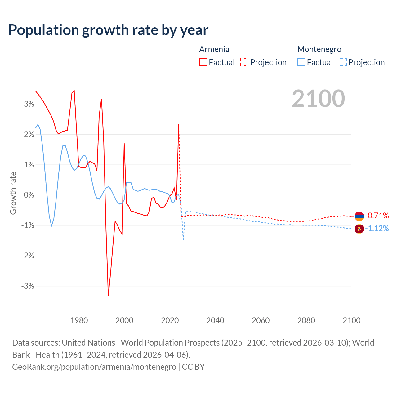 - For the last 10 years, Armenia has had an average growth rate of +0.04% per year vs +0.01% in Montenegro.