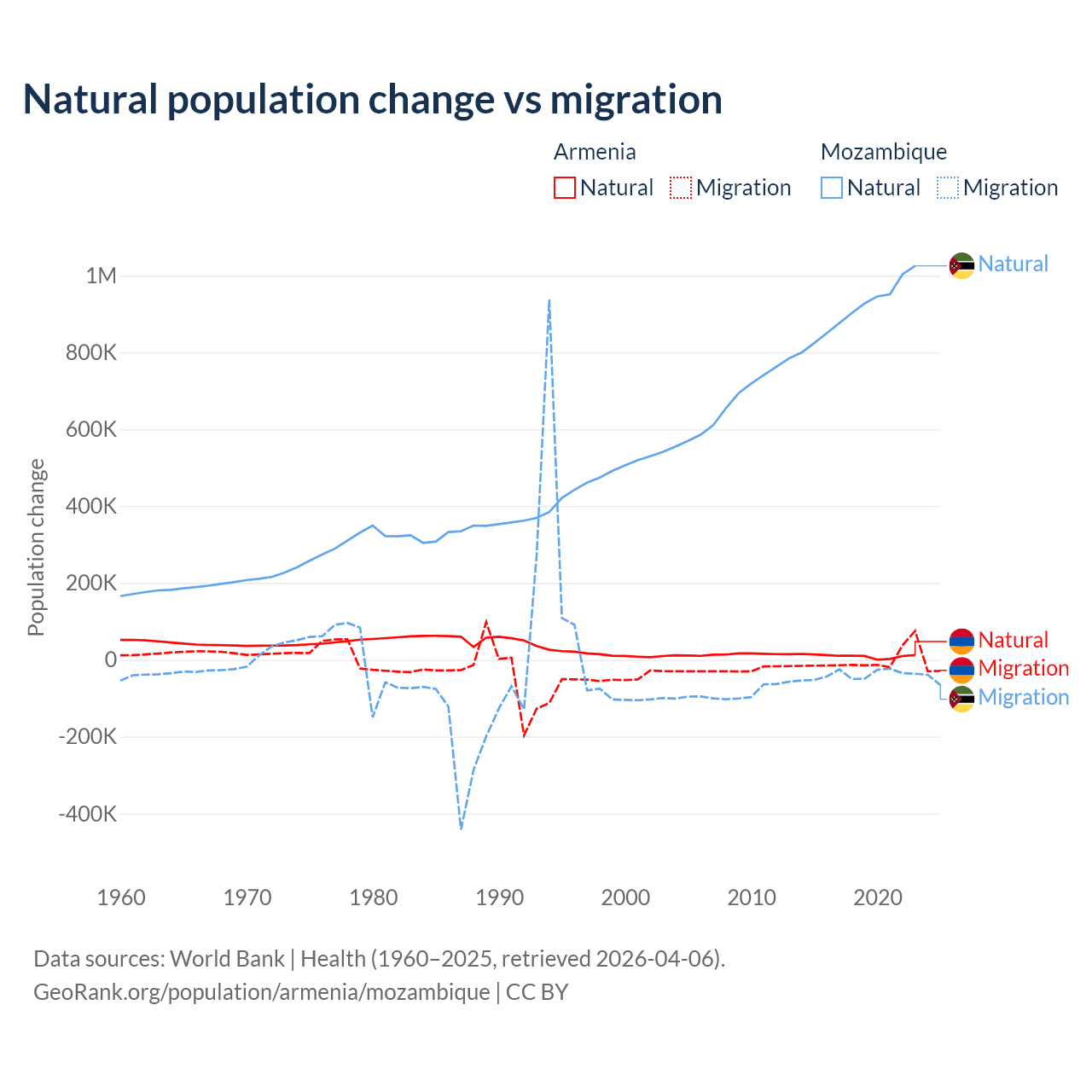 Over the last 10 years, 93.5% of the population change in Armenia is from natural causes (a gain of 97,267 people) and 6.54% is from migration (a loss of 6,808 people). In Mozambique 95.9% is from natural causes (a gain of 9,108,203 people) and 4.15% is from migration (a loss of 393,923 people).