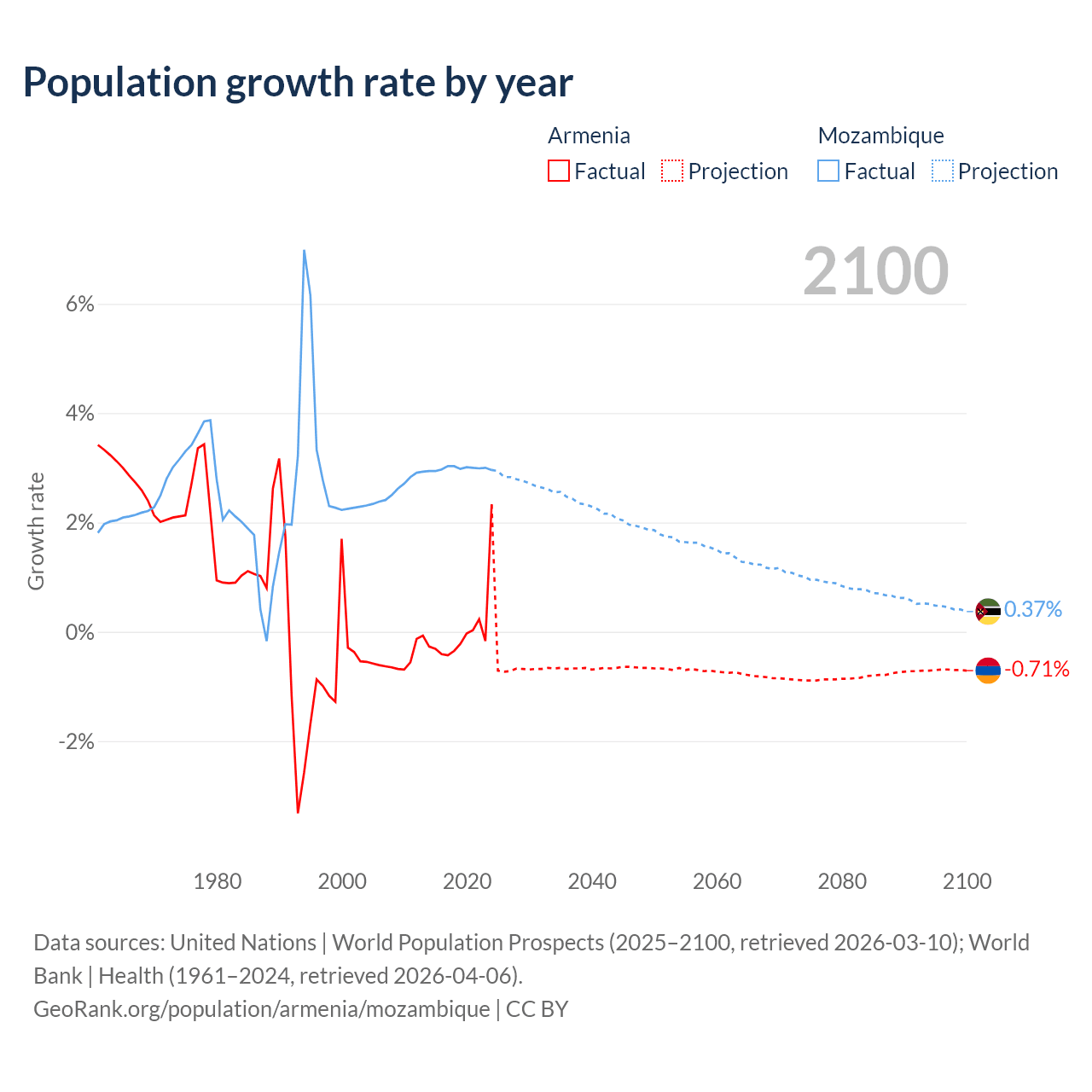 - For the last 10 years, Armenia has had an average growth rate of +0.04% per year vs +2.99% in Mozambique.