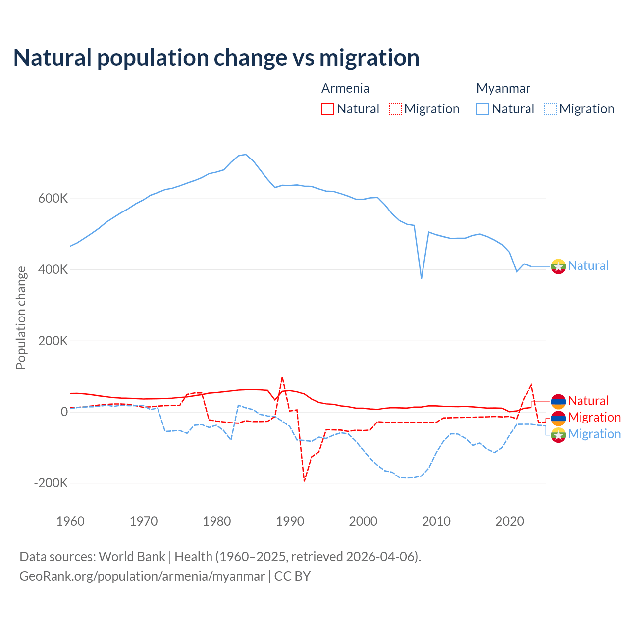 Over the last 10 years, 93.5% of the population change in Armenia is from natural causes (a gain of 97,267 people) and 6.54% is from migration (a loss of 6,808 people). In Myanmar 86% is from natural causes (a gain of 4,594,615 people) and 14% is from migration (a loss of 749,272 people).